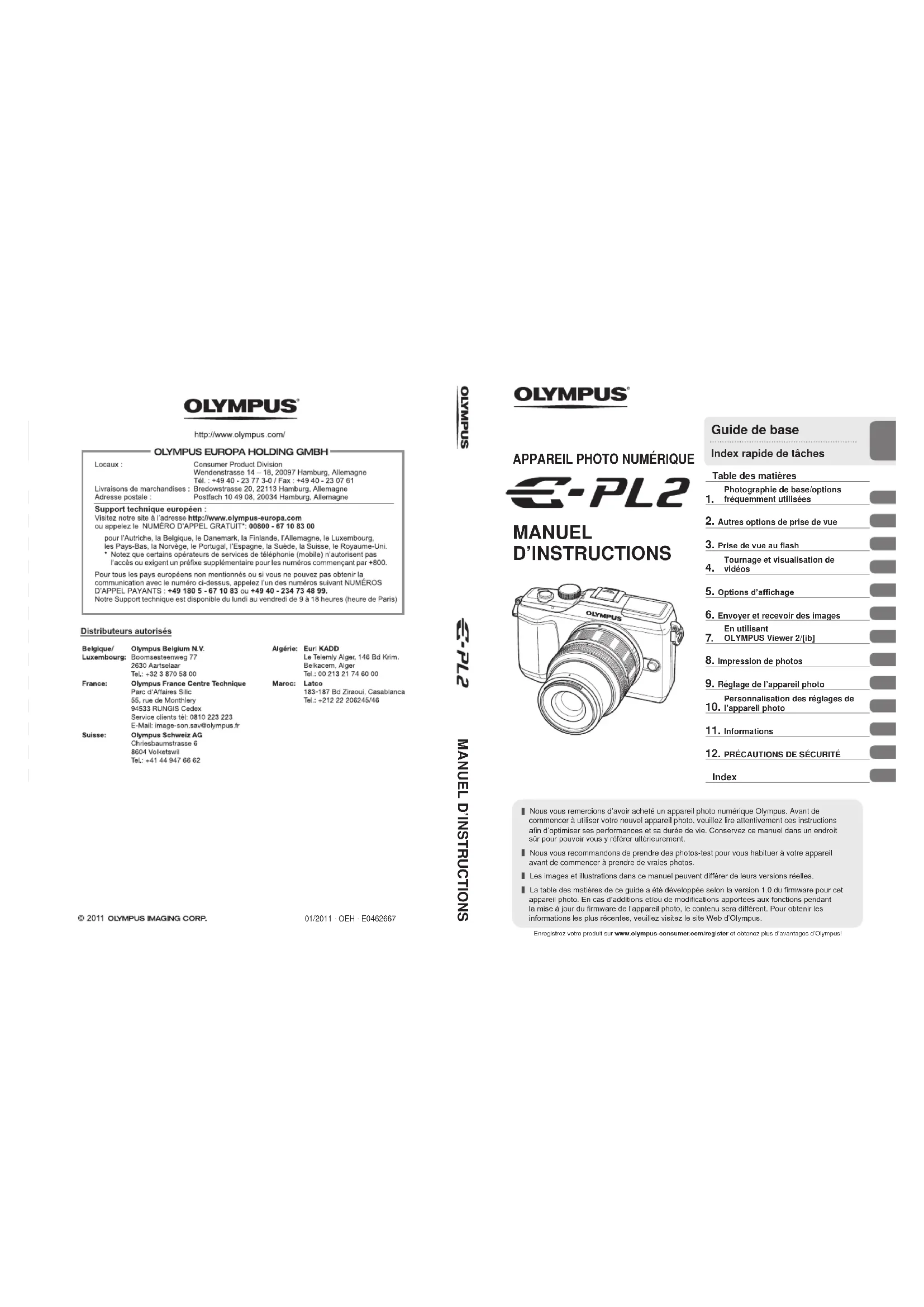 01/2011 · OEH · E0462667 Enregistrez votre produit sur www.olympus-consumer.com/register et obtenez plus d’avantages d’Olympus! Nous vous remercions d’avoir acheté un appareil photo numérique Olympus. Avant de commencer à utiliser votre nouvel appareil photo, veuillez lire attentivement ces instructions an d’optimiser ses performances et sa durée de vie. Conservez ce manuel dans un endroit sûr pour pouvoir vous y référer ultérieurement. Nous vous recommandons de prendre des photos-test pour vous habituer à votre appareil avant de commencer à prendre de vraies photos. Les images et illustrations dans ce manuel peuvent différer de leurs versions réelles. La table des matières de ce guide a été développée selon la version 1.0 du rmware pour cet appareil photo. En cas d’additions et/ou de modications apportées aux fonctions pendant la mise à jour du rmware de l’appareil photo, le contenu sera différent. Pour obtenir les informations les plus récentes, veuillez visitez le site Web d’Olympus. Guide de base Index rapide de tâches Table des matières Photographie de base/options fréquemment utilisées