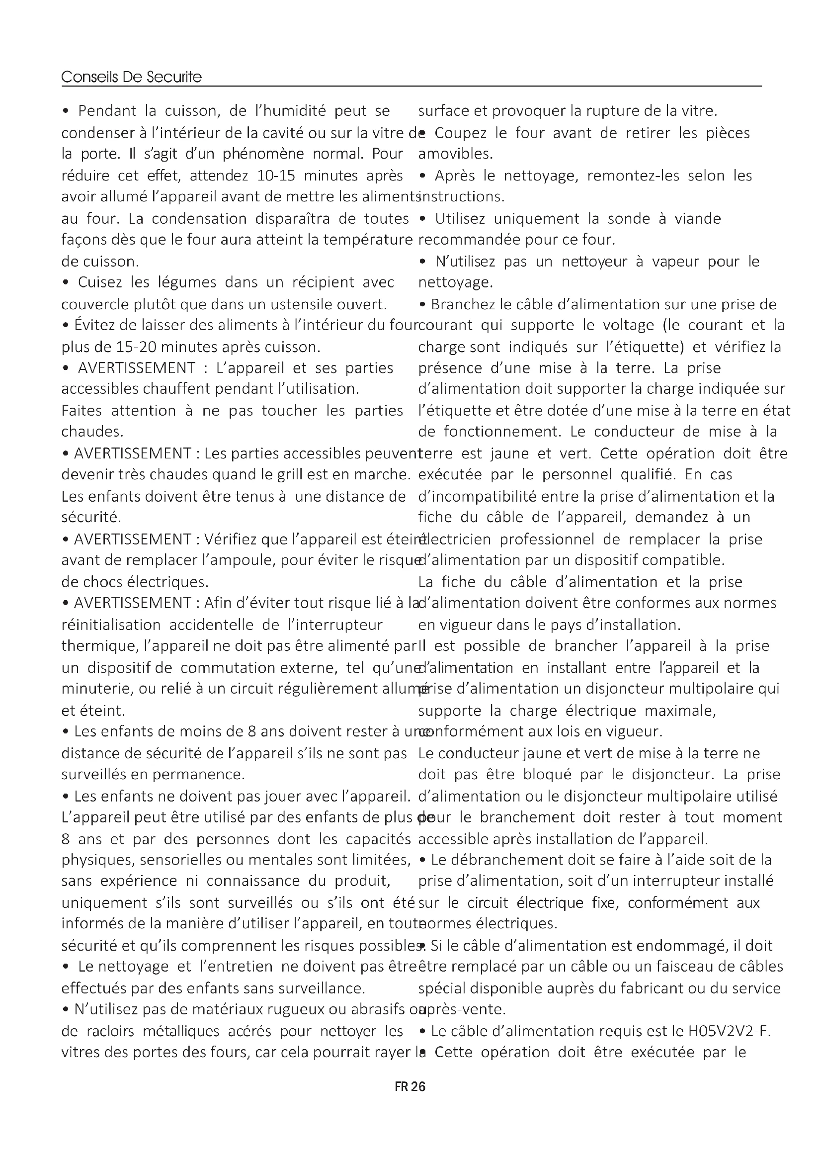 - Cette opération doit être exécutée par le Conseils De Securite FR 26personnel qualifié. Le conducteur de mise à la terre (jaune et vert) doit être environ 10 mm plus long que les autres conducteurs. Pour toutes réparations, contactez le service après-vente en insistant sur l’utilisation de pièces de rechange d’origine.