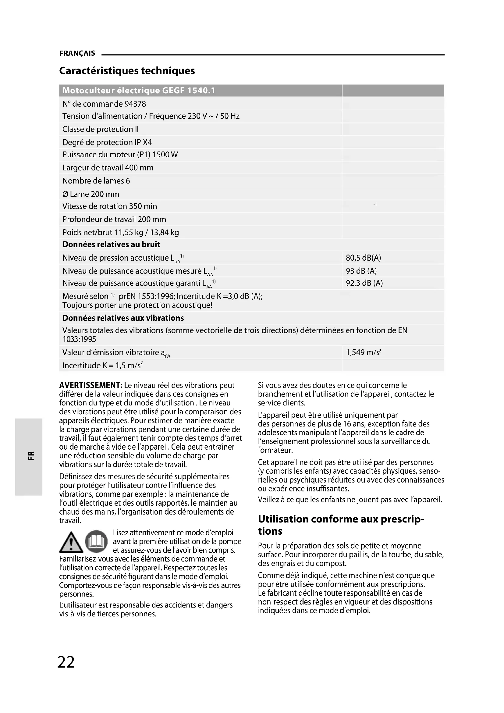 rielles ou psychiques réduites ou avec des connaissances ou expérience insusantes. Veillez à ce que les enfants ne jouent pas avec l‘appareil. Utilisation conforme aux prescrip- tions Pour la préparation des sols de petite et moyenne surface. Pour incorporer du paillis, de la tourbe, du sable, des engrais et du compost. Comme déjà indiqué, cette machine n’est conçue que pour être utilisée conformément aux prescriptions. Le fabricant décline toute responsabilité en cas de non-respect des règles en vigueur et des dispositions indiquées dans ce mode d‘emploi. FRANÇAIS FR22 23
