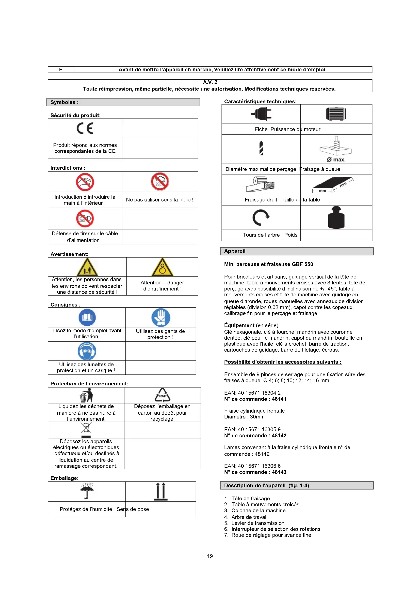 Fiche Puissance du moteur Diamètre maximal de perçage Fraisage à queue Fraisage droit Taille de la table Tours de l’arbre Poids Appareil Mini perceuse et fraiseuse GBF 550 Pour bricoleurs et artisans, guidage vertical de la tête de machine, table à mouvements croisés avec 3 fentes, tête de perçage avec possibilité d’inclinaison de +/- 45°, table à mouvements croisés et tête de machine avec guidage en queue d’aronde, roues manuelles avec anneaux de division réglables (division 0,02 mm), capot contre les copeaux, calibrage fin pour le perçage et fraisage. Équipement (en série): Clé hexagonale, clé à fourche, mandrin avec couronne dentée, clé pour le mandrin, capot du mandrin, bouteille en plastique avec l’huile, clé à crochet, barre de traction, cartouches de guidage, barre de filetage, écrous. Possibilité d’obtenir les accessoires suivants : Ensemble de 9 pinces de serrage pour une fixation sûre des fraises à queue. Ø 4; 6; 8; 10; 12; 14; 16 mm EAN: 40 15671 16304 2 N° de commande : 48141 Fraise cylindrique frontale Diamètre : 30mm EAN: 40 15671 16305 9 N° de commande : 48142 Lames convenant à la fraise cylindrique frontale n° de commande : 48142 EAN: 40 15671 16306 6 N° de commande : 48143 Description de l’appareil (fig. 1-4)