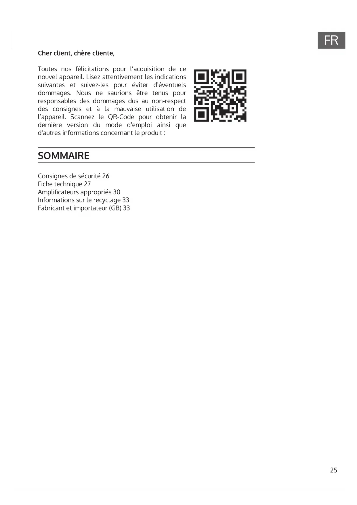 Cher client, chère cliente, Toutes nos félicitations pour l’acquisition de ce nouvel appareil. Lisez attentivement les indications suivantes et suivez-les pour éviter d'éventuels dommages. Nous ne saurions être tenus pour responsables des dommages dus au non-respect des consignes et à la mauvaise utilisation de l’appareil. Scannez le QR-Code pour obtenir la dernière version du mode d'emploi ainsi que d'autres informations concernant le produit: SOMMAIRE Consignes de sécurité 26 Fiche technique 27 Amplicateurs appropriés 30 Informations sur le recyclage 33 Fabricant et importateur (GB) 3326