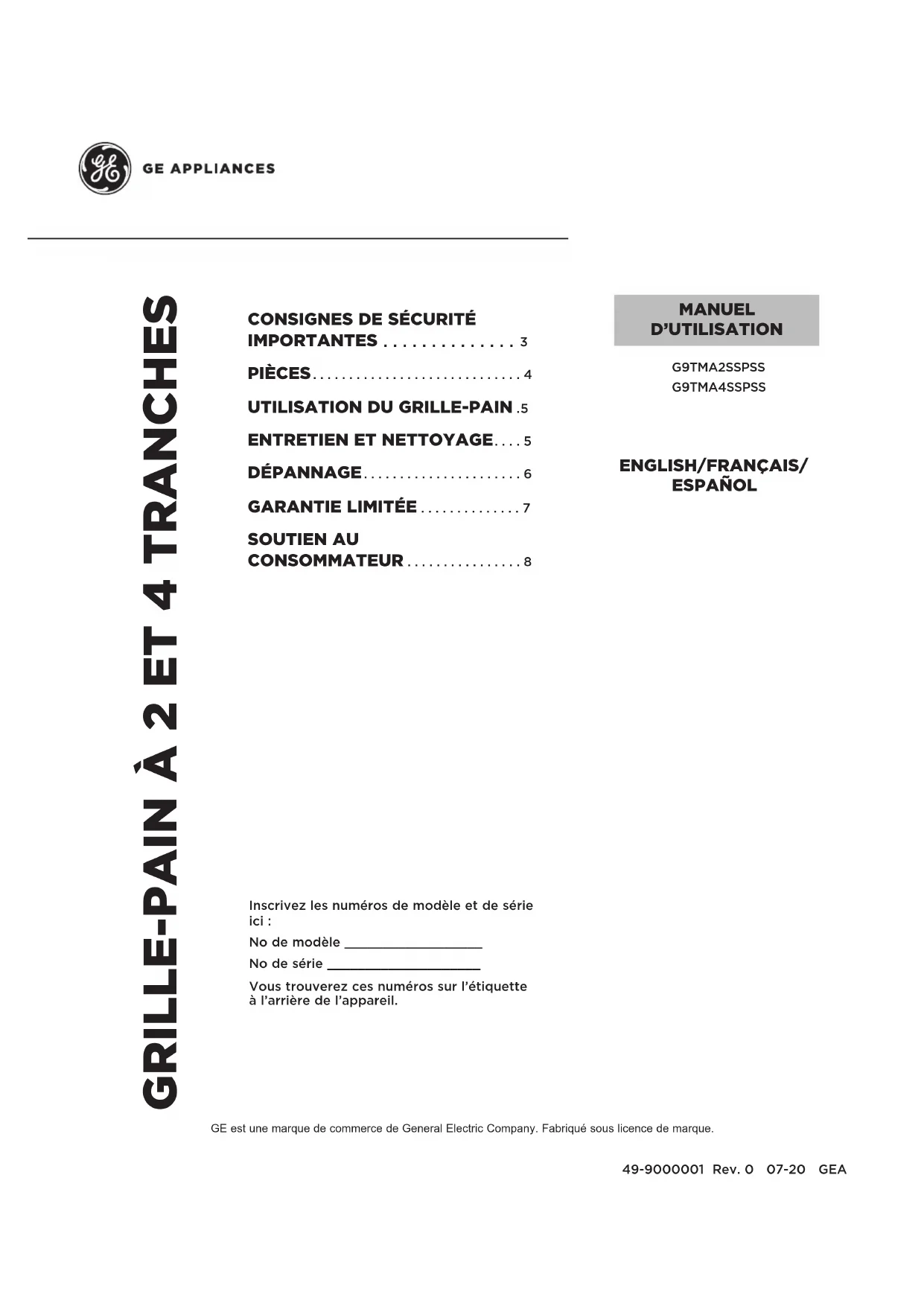 SOUTIEN AU CONSOMMATEUR ................8 Inscrivez les numéros de modèle et de série ici : No de modèle __________________ No de série ____________________ Vous trouverez ces numéros sur l’étiquette à l’arrière de l’appareil. GE est une marque de commerce de General Electric Company. Fabriqué sous licence de marque. MANUEL D’UTILISATION2 49-9000001 Rev. 0 NOUS VOUS REMERCIONS D’INTÉGRER GE APPLIANCES À VOTRE DEMEURE. Que vous ayez grandi avec des électroménagers GE ou qu’il s’agisse de votre première acquisition, nous sommes heureux de vous accueillir dans notre famille. Nous sommes fiers du savoir-faire, de l’innovation et du design qui constituent chaque électroménager GE, et nous pensons que vous le serez aussi. Nous vous rappelons que l’enregistrement de votre électroménager vous assure de recevoir des renseignements importants sur le produit et la garantie lorsque vous en avez besoin.49-9000001 Rev. 0 3 AVERTISSEMENT Veuillez lire toutes les consignes de sécurité avant d’utiliser le produit. L’omission d'observer ces consignes peut poser une risque d’incendie, de choc électrique, de blessure grave ou fatale. CONSIGNES DE SÉCURITÉ GÉNÉRALES