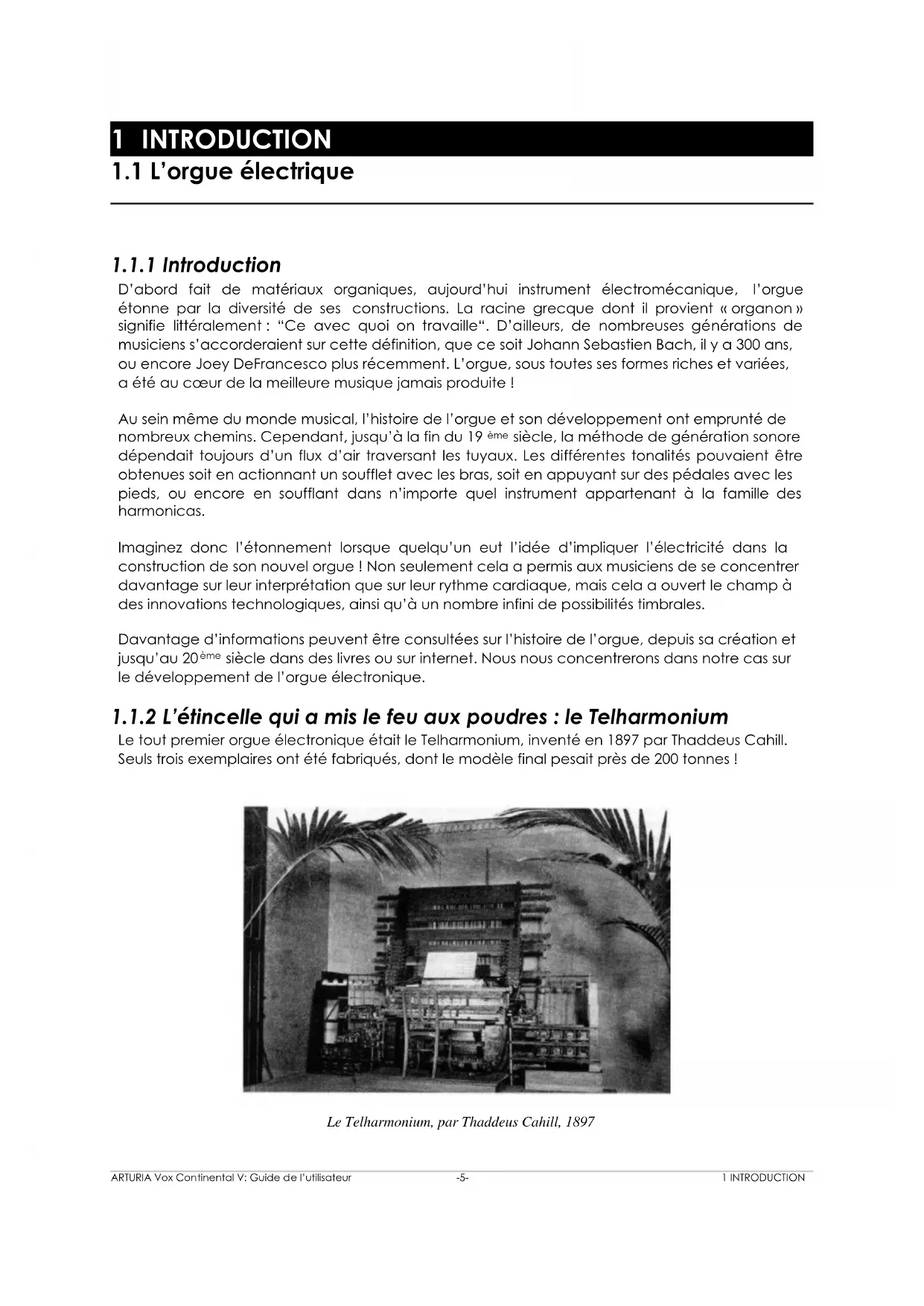 Le tout premier orgue électronique était le Telharmonium, inventé en 1897 par Thaddeus Cahill. Seuls trois exemplaires ont été fabriqués, dont le modèle final pesait près de 200 tonnes ! Le Telharmonium, par Thaddeus Cahill, 1897ARTURIA Vox Continental V: Guide de l’utilisateur -6- 1 INTRODUCTION Le Telharmonium (également connu sous le nom de “Dynamophone“) pouvait à l’origine être entendu à travers des câbles électriques attachés à des “cônes en papier“, qui n’étaient rien de plus que les ancêtres des haut-parleurs que l’on connaît aujourd’hui. La musique qu’il produisait était alors transmise dans divers endroits dans New York City, à l’aide du système téléphonique, alors en pleine expansion. Entre 1906 et 1908, plusieurs performances furent données dans une salle prévue à cet effet, et accueillies de façon plutôt unanime. “Construisez-le et ils viendront…disaient-ils“. Ils étaient bien obligés, dirons-nous : le Telharmonium n’était pas vraiment… “Portable“ ! Malheureusement, il ne reste aujourd’hui aucun enregistrement du Telharmonium. En revanche, de nombreux sites web proposent une abondance d’informations sur ce fascinant et révolutionnaire instrument.