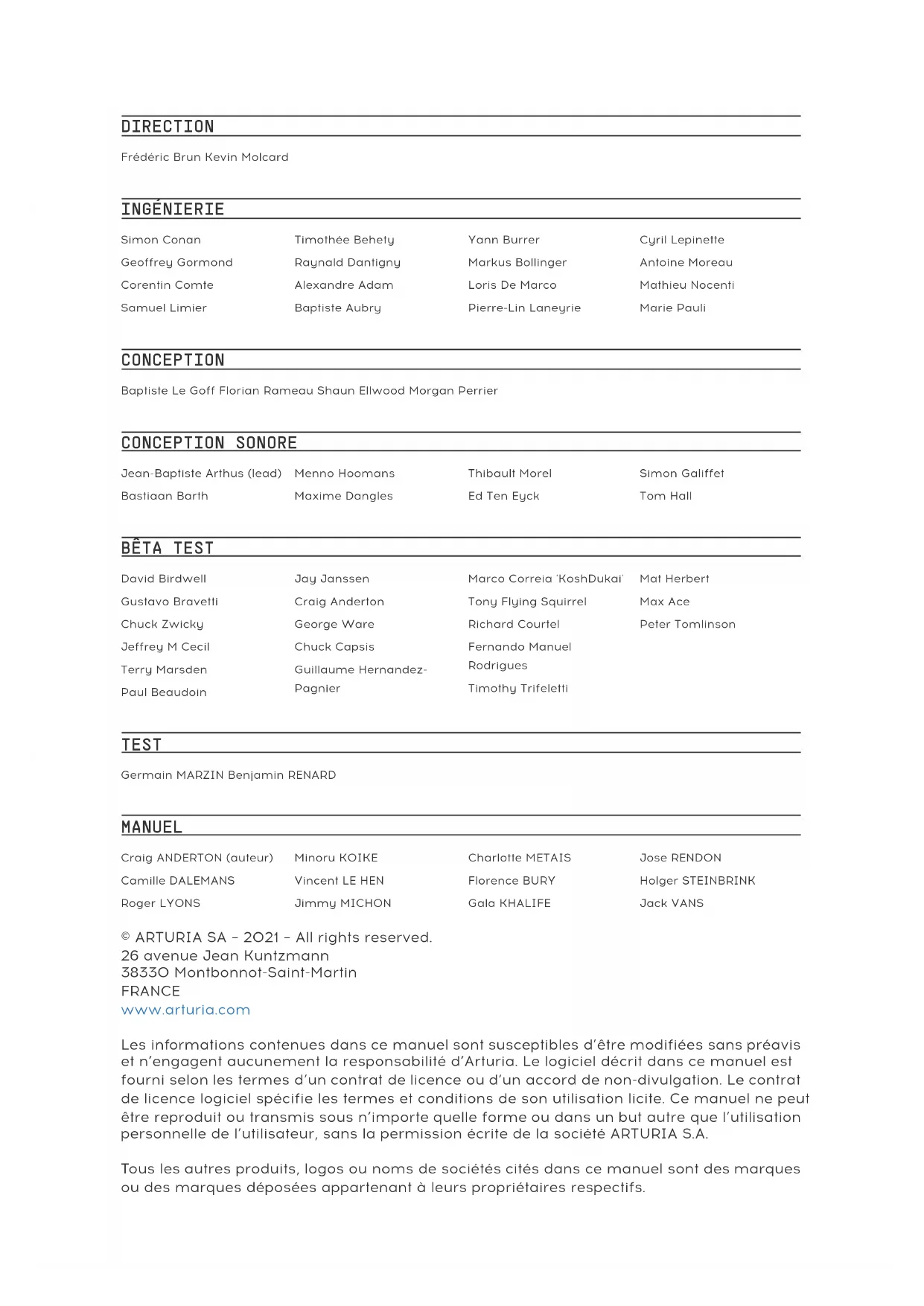 logiciel selon les termes et conditions du présent contrat. Vous n'êtes pas autorisé à louer ou prêter ce logiciel, ni à le concéder sous licence. L'utilisation du logiciel cédé en réseau est illégale si celle-ci rend possible l’utilisation multiple et simultanée du programme. Vous êtes autorisé à installer une copie de sauvegarde du logiciel qui ne sera pas employée à d'autres fins que le stockage. En dehors de cette énumération, le présent contrat ne vous concède aucun autre droit d'utilisation du logiciel. Arturia se réserve tous les droits qui n'ont pas été expressément accordés.