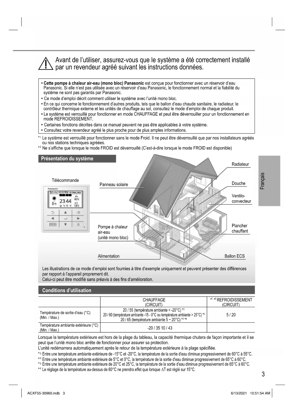 - Cette pompe à chaleur air-eau (mono bloc) Panasonic est conçue pour fonctionner avec un réservoir d’eau Panasonic. Si elle n’est pas utilisée avec un réservoir d’eau Panasonic, le fonctionnement normal et la fi abilité du système ne sont pas garantis par Panasonic.