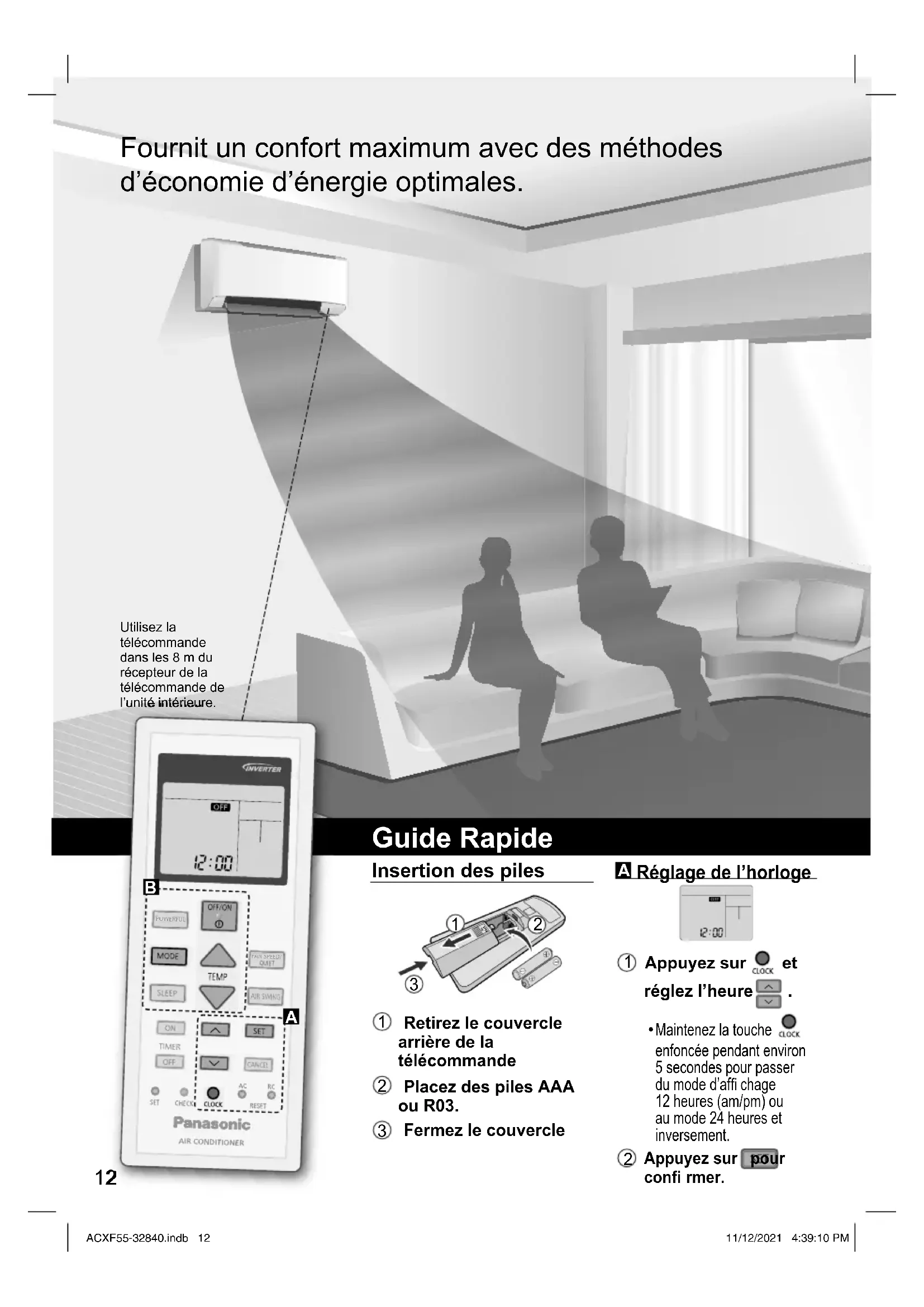 - Some error code may not be applicable to your model. Consult an authorised dealer for clarifi cation. Troubleshooting ACXF55-32840.indb 10ACXF55-32840.indb 10 11/12/2021 4:39:10 PM11/12/2021 4:39:10 PM11 English Memo Troubleshooting ACXF55-32840.indb 11ACXF55-32840.indb 11 11/12/2021 4:39:10 PM11/12/2021 4:39:10 PM12 Fournit un confort maximum avec des méthodes d’économie d’énergie optimales. Utilisez la télécommande dans les 8 m du récepteur de la télécommande de l’unité intérieure. Guide Rapide Insertion des piles OPEN