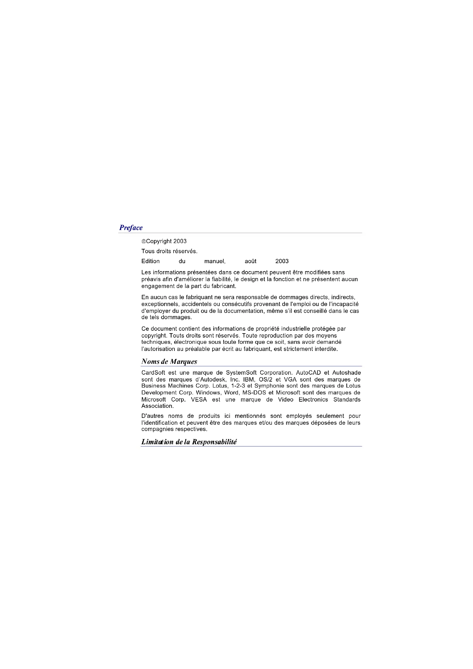 Copyright 2003 Tous droits réservés. Edition du manuel, août 2003 Les informations présentées dans ce document peuvent être modifiées sans préavis afin d'améliorer la fiabilité, le design et la fonction et ne présentent aucun engagement de la part du fabricant. En aucun cas le fabriquant ne sera responsable de dommages directs, indirects, exceptionnels, accidentels ou consécutifs provenant de l'emploi ou de l'incapacité d'employer du produit ou de la documentation, même s’il est conseillé dans le cas de tels dommages. Ce document contient des informations de propriété industrielle protégée par copyright. Touts droits sont réservés. Toute reproduction par des moyens techniques, électronique sous toute forme que ce soit, sans avoir demandé l'autorisation au préalable par écrit au fabriquant, est strictement interdite.