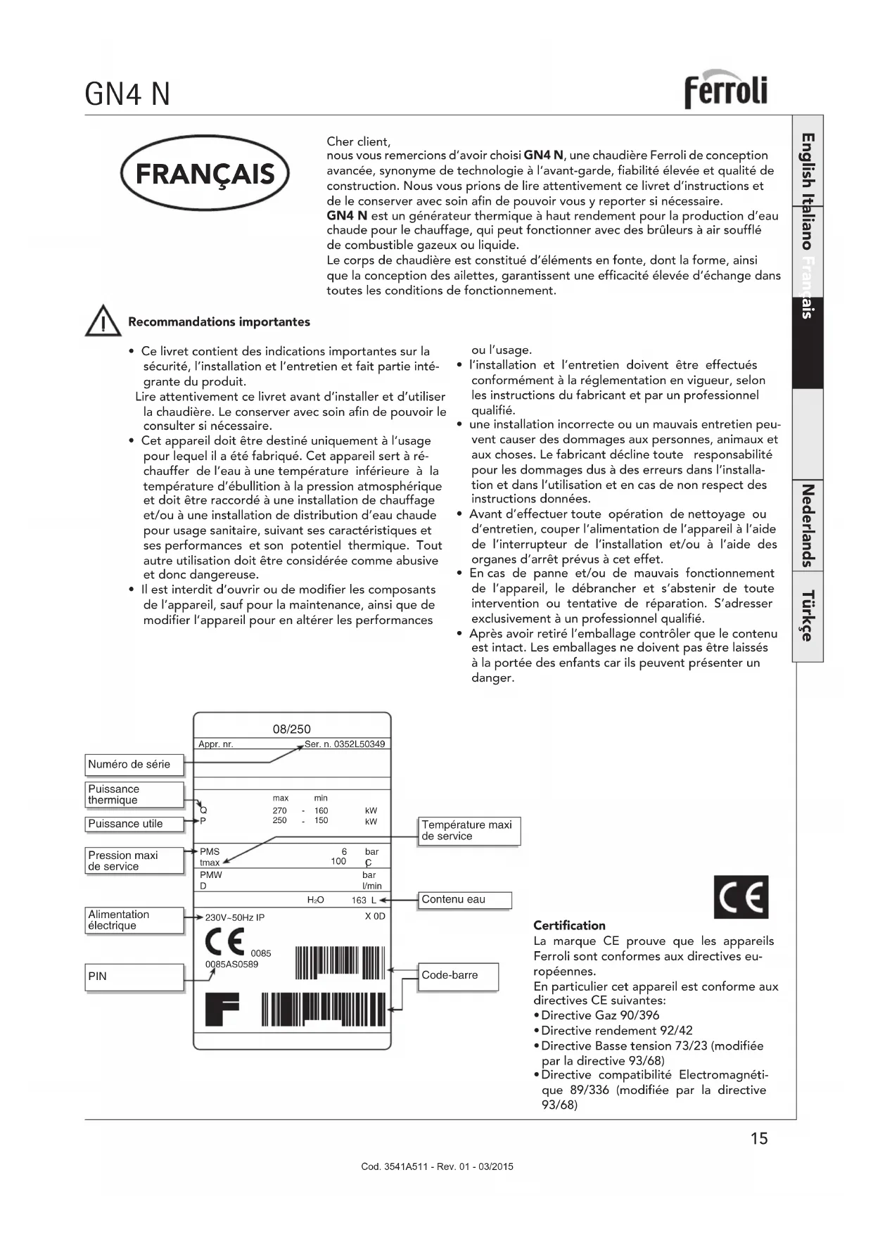 Téléchargez la notice de votre Chaudière de chauffage central au format PDF gratuitement ! Retrouvez votre notice GN4 N - FERROLI et reprennez votre appareil électronique en main. Sur cette page sont publiés tous les documents nécessaires à l'utilisation de votre appareil GN4 N de la marque FERROLI.