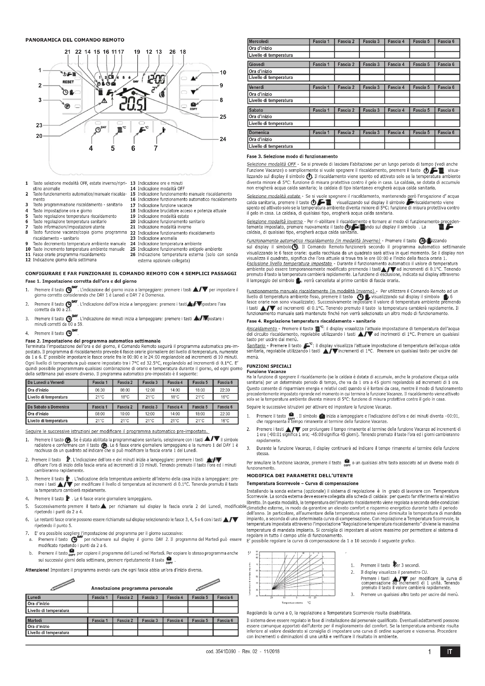 cod. 3541D390 - Rev. 02 - 11/2018 5Température évolutive – Déplacement parallèle des courbes Une fois programmée la courbe de compensation il est possible de régler le déplacement parallèle des courbes de 20 à 40 comme indiqué par les graphiques: Activation programmation sanitaire Suivre les instructions pour activer le programme sanitaire.