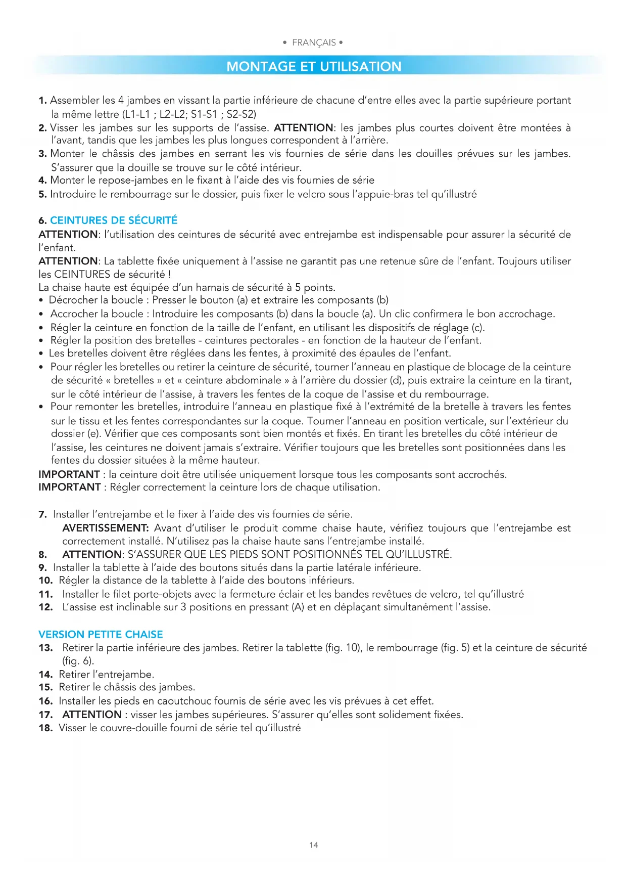 - L’utilisation de la ceinture de sécurité avec harnais entrejambe, fixée correctement à l’assise, de la barrière et du rembourrage est indispensable pour assurer la sécurité de l’enfant, lorsque le produit est utilisé comme chaise haute. Toujours utiliser les ceintures de sécurité.