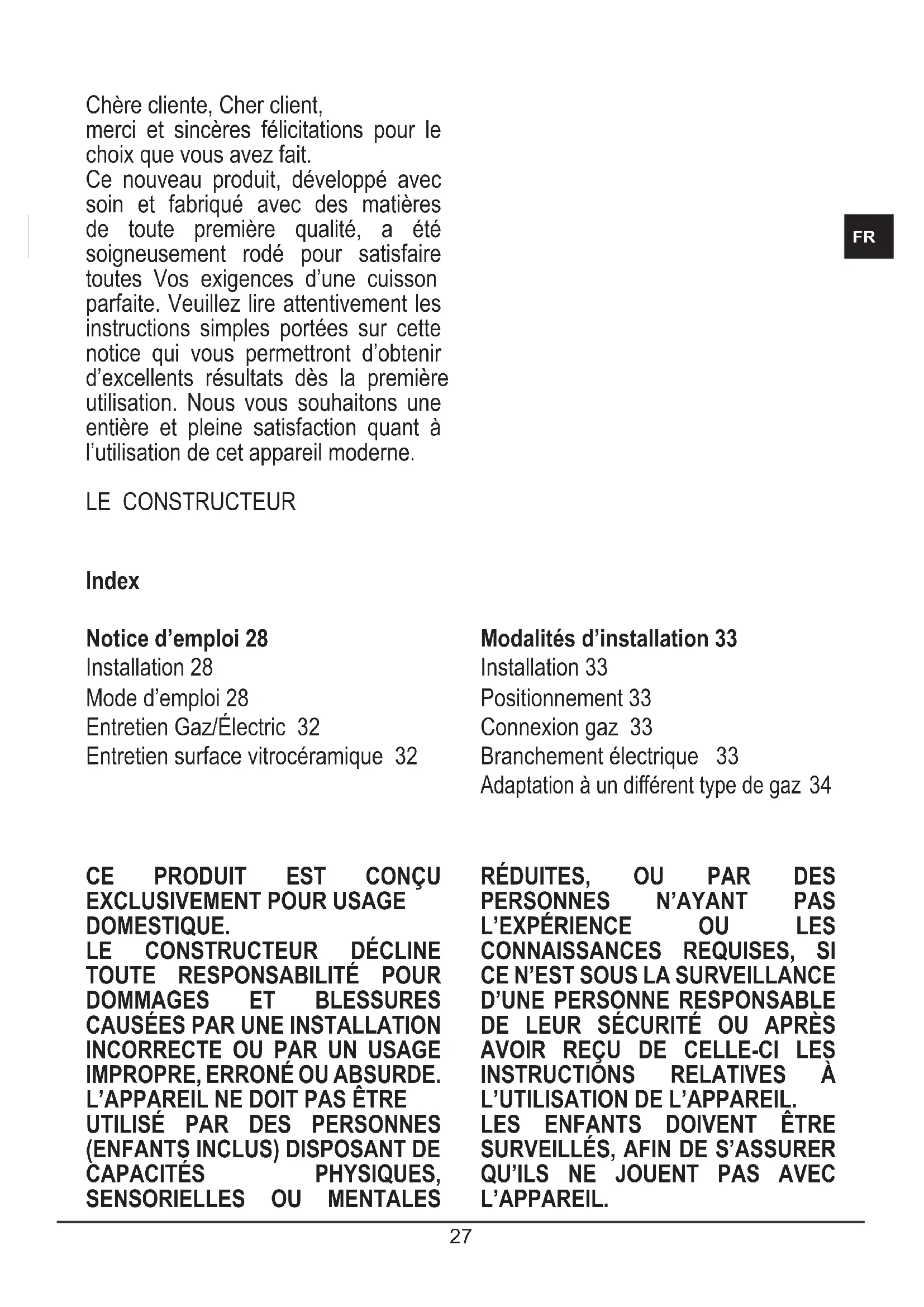 Chère cliente, Cher client, merci et sincères félicitations pour le choix que vous avez fait. Ce nouveau produit, développé avec soin et fabriqué avec des matières de toute première qualité, a été soigneusement rodé pour satisfaire toutes Vos exigences d’une cuisson parfaite. Veuillez lire attentivement les instructions simples portées sur cette notice qui vous permettront d’obtenir d’excellents résultats dès la première utilisation. Nous vous souhaitons une entière et pleine satisfaction quant à l’utilisation de cet appareil moderne. LE CONSTRUCTEUR Index Notice d’emploi 28 Installation 28 Mode d’emploi 28 Entretien Gaz/Électric 32 Entretien surface vitrocéramique 32 Modalités d’installation 33 Installation 33 Positionnement 33 Connexion gaz 33 Branchement électrique 33 Adaptation à un diérent type de gaz