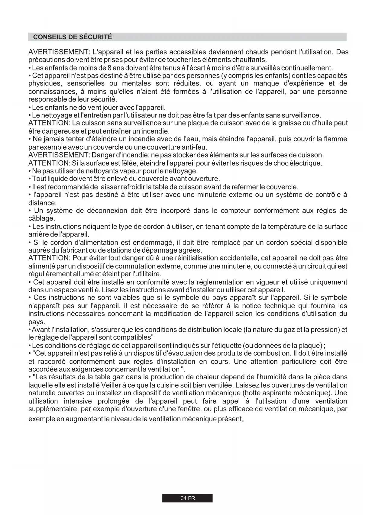 - Le nettoyage et l'entretien par l'utilisateur ne doit pas être fait par des enfants sans surveillance. ATTENTION: La cuisson sans surveillance sur une plaque de cuisson avec de la graisse ou d'huile peut être dangereuse et peut entraîner un incendie.