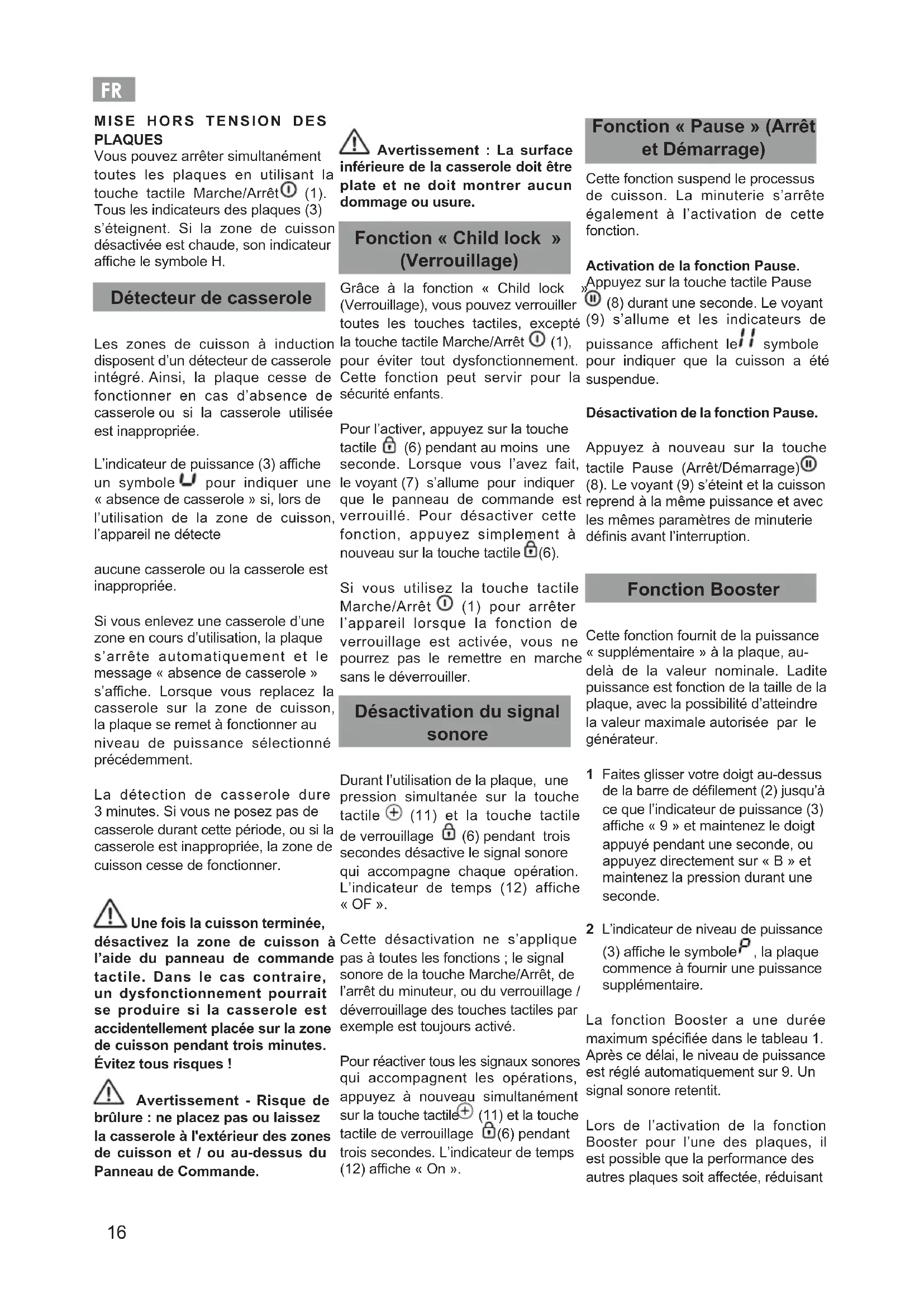 inférieure de la casserole doit être plate et ne doit montrer aucun dommage ou usure. Fonction « Child lock » (Verrouillage) Grâce à la fonction « Child lock » (Verrouillage), vous pouvez verrouiller toutes les touches tactiles, excepté la touche tactile Marche/Arrêt (1), pour éviter tout dysfonctionnement. Cette fonction peut servir pour la sécurité enfants. Pour l’activer, appuyez sur la touche tactile (6) pendant au moins une seconde. Lorsque vous l’avez fait, le voyant (7) s’allume pour indiquer que le panneau de commande est verrouillé. Pour désactiver cette fonction, appuyez simplement à nouveau sur la touche tactile (6). Si vous utilisez la touche tactile Marche/Arrêt (1) pour arrêter l’appareil lorsque la fonction de verrouillage est activée, vous ne pourrez pas le remettre en marche sans le déverrouiller. Désactivation du signal sonore Durant l’utilisation de la plaque, une pression simultanée sur la touche tactile (11) et la touche tactile de verrouillage (6) pendant trois secondes désactive le signal sonore qui accompagne chaque opération. L’indicateur de temps (12) affiche « OF ». Cette désactivation ne s’applique pas à toutes les fonctions ; le signal sonore de la touche Marche/Arrêt, de l’arrêt du minuteur, ou du verrouillage / déverrouillage des touches tactiles par exemple est toujours activé. Pour réactiver tous les signaux sonores qui accompagnent les opérations, appuyez à nouveau simultanément sur la touche tactile (11) et la touche tactile de verrouillage (6) pendant trois secondes. L’indicateur de temps (12) ache « On ». Fonction « Pause » (Arrêt et Démarrage) Cette fonction suspend le processus de cuisson. La minuterie s’arrête également à l’activation de cette fonction. Activation de la fonction Pause. Appuyez sur la touche tactile Pause (8) durant une seconde. Le voyant (9) s’allume et les indicateurs de puissance affichent le symbole pour indiquer que la cuisson a été suspendue. Désactivation de la fonction Pause. Appuyez à nouveau sur la touche tactile Pause (Arrêt/Démarrage) (8). Le voyant (9) s’éteint et la cuisson reprend à la même puissance et avec les mêmes paramètres de minuterie dénis avant l’interruption. Fonction Booster Cette fonction fournit de la puissance « supplémentaire » à la plaque, au- delà de la valeur nominale. Ladite puissance est fonction de la taille de la plaque, avec la possibilité d’atteindre la valeur maximale autorisée par le générateur. 1 Faites glisser votre doigt au-dessus de la barre de délement (2) jusqu’à ce que l’indicateur de puissance (3) ache « 9 » et maintenez le doigt appuyé pendant une seconde, ou appuyez directement sur « B » et maintenez la pression durant une seconde. 2 L’indicateur de niveau de puissance (3) ache le symbole , la plaque commence à fournir une puissance supplémentaire. La fonction Booster a une durée maximum spéciée dans le tableau 1. Après ce délai, le niveau de puissance est réglé automatiquement sur 9. Un signal sonore retentit. Lors de l’activation de la fonction Booster pour l’une des plaques, il est possible que la performance des autres plaques soit aectée, réduisantFR