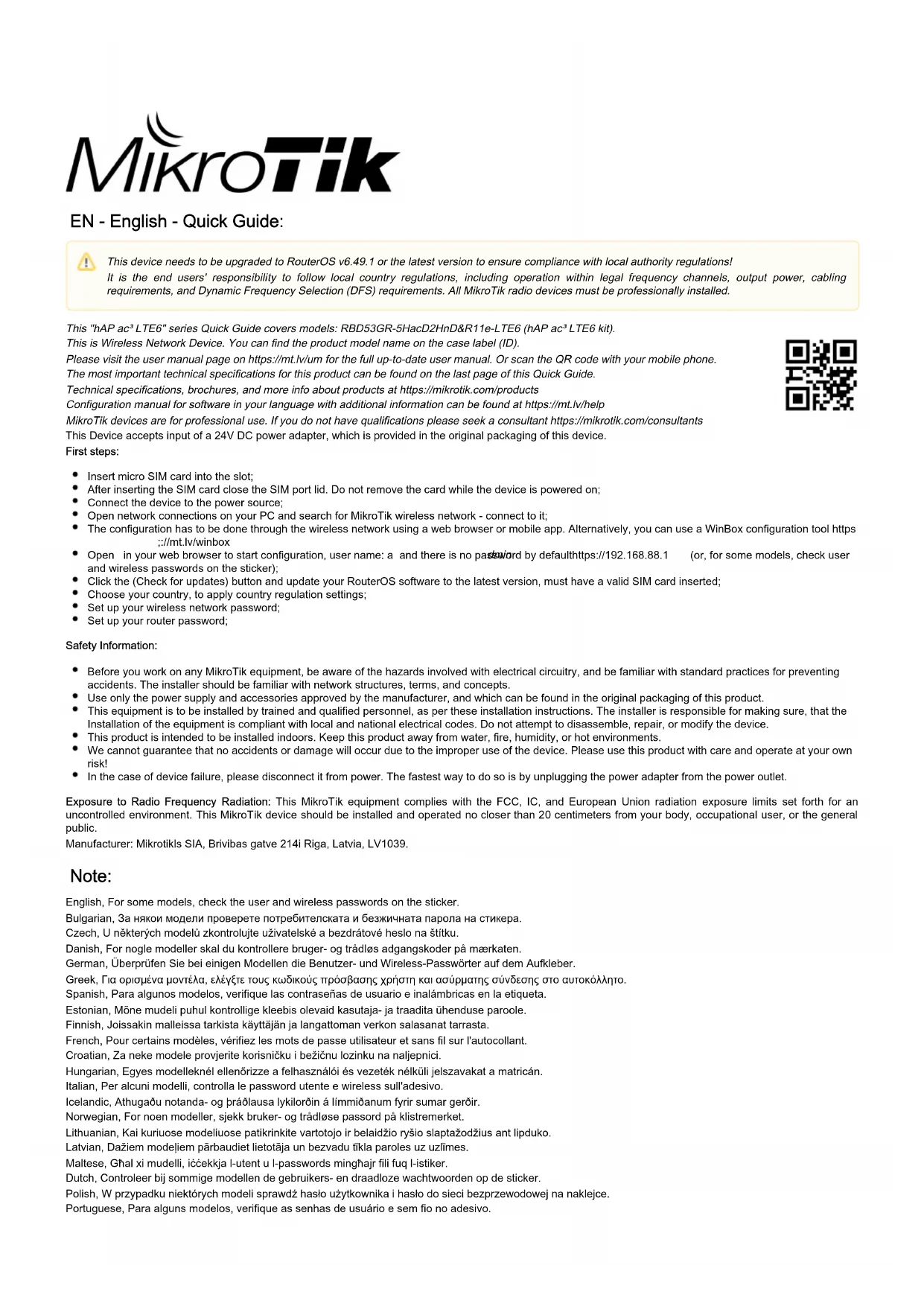 Il s'agit d'un périphérique réseau sans fil. Vous pouvez trouver le nom du modèle du produit sur l'étiquette du boîtier (ID). Veuillez visiter la page du manuel d'utilisation sur pour le manuel d'utilisation complet et à jour.https://mt.lv/um-fr Ou scannez le code QR avec votre téléphone portable. Les spécifications techniques les plus importantes de ce produit se trouvent sur la dernière page de ce guide rapide. Spécifications techniques, brochures et plus d'informations sur les produits surhttps://mikrotik.com/products Vous trouverez le manuel de configuration du logiciel dans votre langue avec des informations supplémentaires sur https://mt.lv/help-fr Les appareils MikroTik sont destinés à un usage professionnel. Si vous n'avez pas de qualifications, veuillez consulter un consultant https://mikrotik.com /consultants Cet appareil accepte l'entrée d'un adaptateur d'alimentation 24 V CC, qui est fourni dans l'emballage d'origine de cet appareil. Premiers pas: Insérez la carte micro SIM dans la fente; Après avoir inséré la carte SIM, fermez le couvercle du port SIM. Ne retirez pas la carte lorsque l'appareil est sous tension; Connectez l'appareil à la source d'alimentation; Ouvrez les connexions réseau sur votre PC et recherchez le réseau sans fil MikroTik - connectez-vous à celui-ci; La configuration doit être effectuée via le réseau sans fil à l'aide d'un navigateur Web ou d'une application mobile. Alternativement, vous pouvez utiliser un outil de configuration WinBox ;https://mt.lv/winbox Ouvert https://192.168.88.1 dans votre navigateur Web pour démarrer la configuration, nom d'utilisateur: a dmin et il n'y a pas de mot de passe par défaut; Lorsque vous utilisez une application mobile, choisissez Configuration rapide et elle vous guidera à travers toute la configuration nécessaire en six étapes faciles; Cliquez sur le bouton (Check for updates) et mettez à jour votre logiciel RouterOS vers la dernière version, une carte SIM valide doit être insérée; Choisissez votre pays pour appliquer les paramètres de réglementation du pays; Configurez votre mot de passe de réseau sans fil; Configurez le mot de passe de votre routeur; Information sur la sécurité: Cet appareil doit être mis à niveau vers RouterOS v6.49.1 ou la dernière version pour garantir la conformité aux réglementations des autorités locales. Il est de la responsabilité des utilisateurs finaux de suivre les réglementations locales du pays, y compris le fonctionnement dans les canaux de