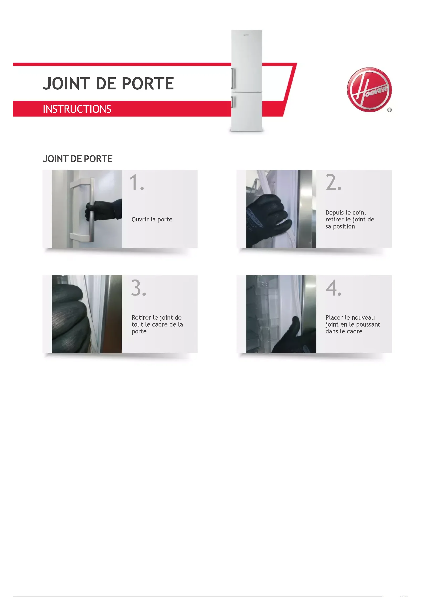 POIGNÉEINSTRUCTIONS Ouvrir la porte Depuis le coin, retirer le joint de sa position