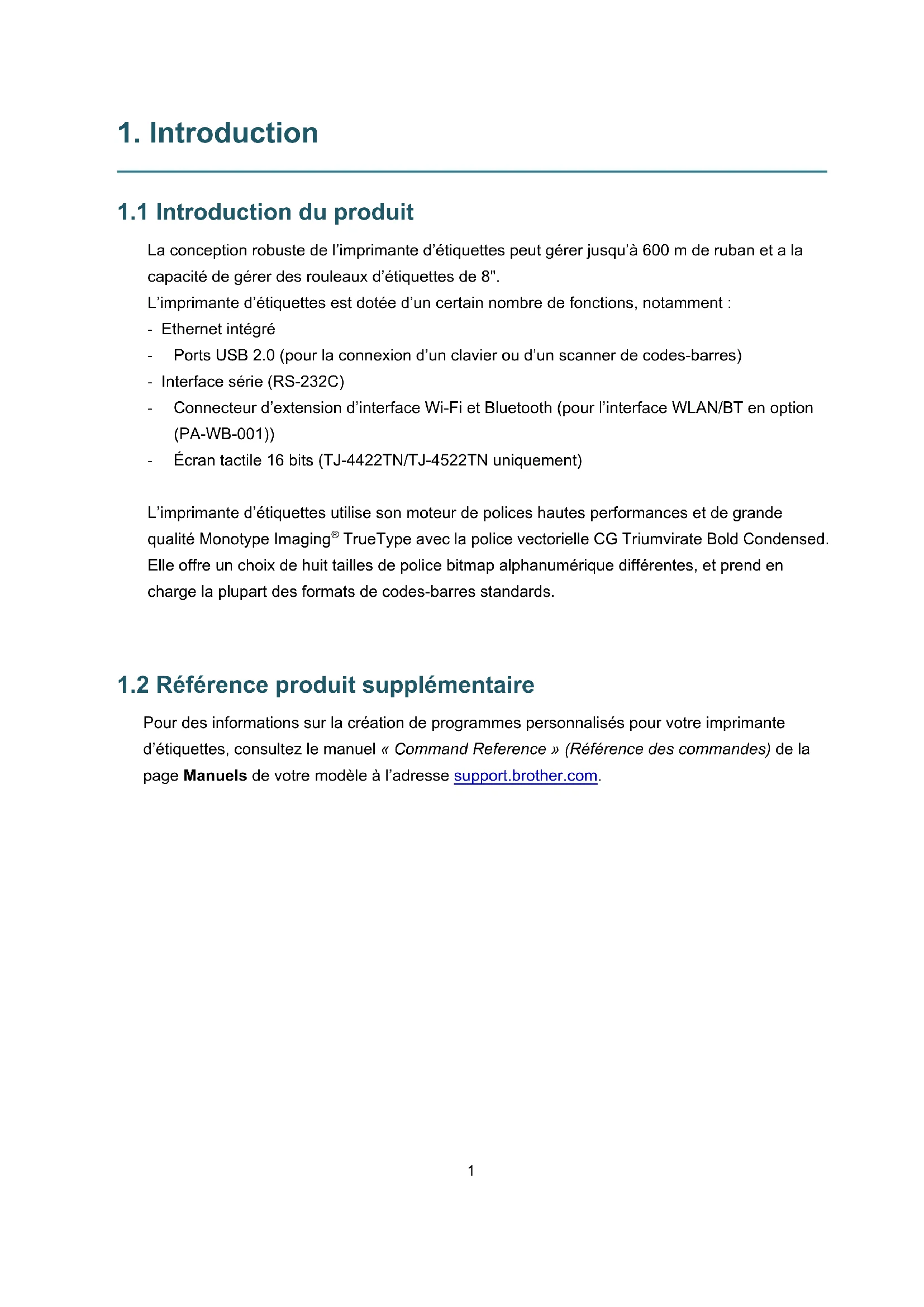 sont des marques commerciales déposées appartenant à Bluetooth SIG, Inc. et toute utilisation de ces marques par Brother Industries, Ltd. se fait sous licence. CG Triumvirate est une marque commerciale d’Agfa Corporation. La police CG Triumvirate Bold Condensed est sous licence de Monotype Corporation. Toutes les autres marques commerciales appartiennent à leurs propriétaires respectifs. Tous les noms commerciaux et noms de produits d’autres sociétés apparaissant sur les produits Brother, les documents connexes et tout autre matériel sont des marques commerciales ou des marques déposées de ces sociétés respectives. Les modèles ne sont pas disponibles dans tous les pays et régions.ii Contenu 1. Introduction .......................................................................................................... 1