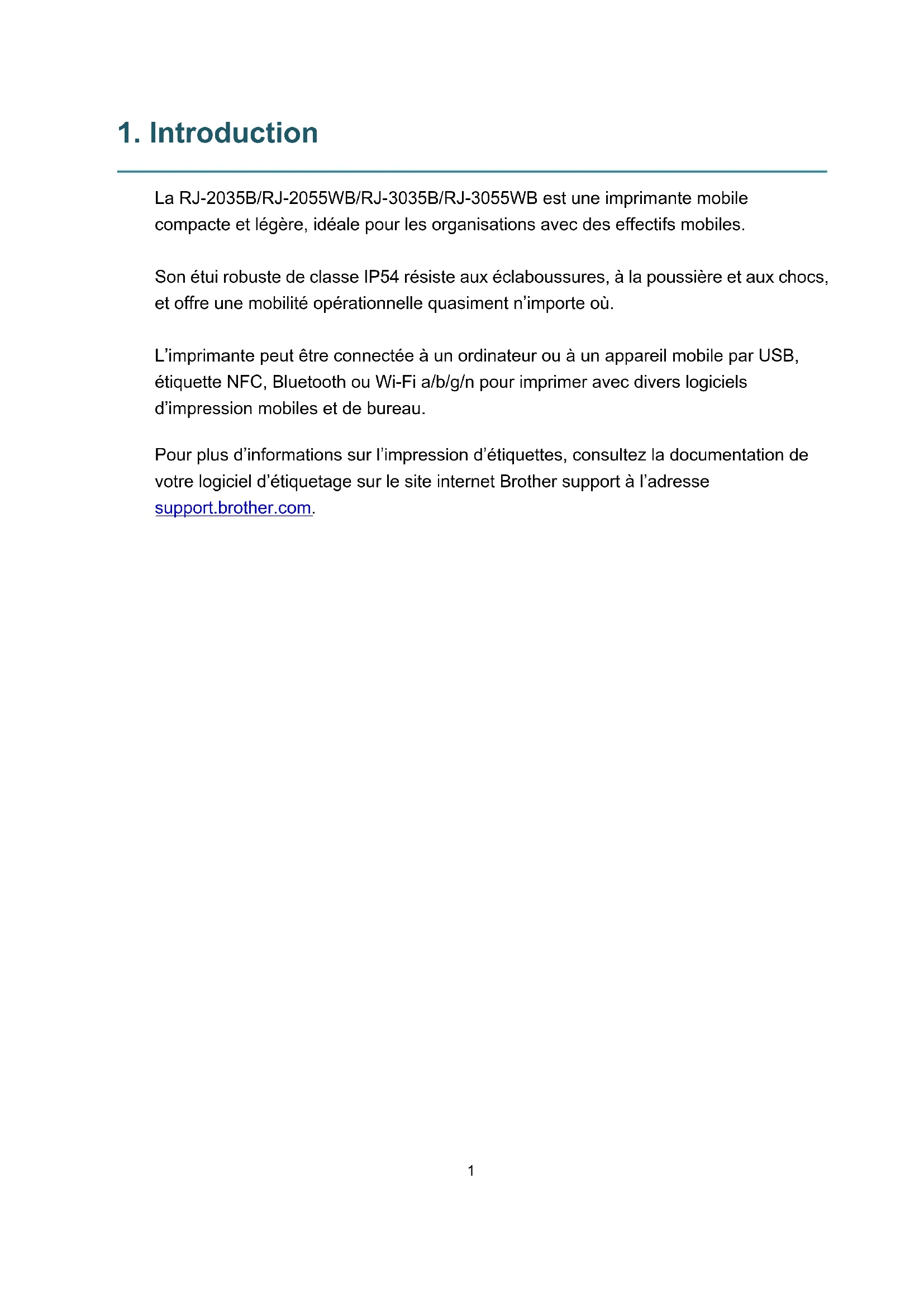 La RJ-2035B/RJ-2055WB/RJ-3035B/RJ-3055WB est une imprimante mobile compacte et légère, idéale pour les organisations avec des effectifs mobiles. Son étui robuste de classe IP54 résiste aux éclaboussures, à la poussière et aux chocs, et offre une mobilité opérationnelle quasiment n’importe où. L’imprimante peut être connectée à un ordinateur ou à un appareil mobile par USB, étiquette NFC, Bluetooth ou Wi-Fi a/b/g/n pour imprimer avec divers logiciels d’impression mobiles et de bureau. Pour plus d’informations sur l’impression d’étiquettes, consultez la documentation de votre logiciel d’étiquetage sur le site internet Brother support à l’adresse support.brother.com.2