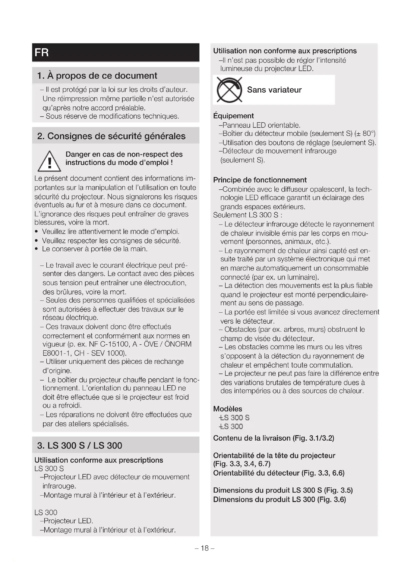 Utilisation conforme aux prescriptions LS300S – Projecteur LED avec détecteur de mouvement infrarouge. – Montage mural à l’intérieur et à l’extérieur. LS300 – Projecteur LED. – Montage mural à l’intérieur et à l’extérieur. Utilisation non conforme aux prescriptions – Il n’est pas possible de régler l’intensité lumineuse du projecteur LED. Sans variateur Équipement – Panneau LED orientable. – Boîtier du détecteur mobile (seulement S) (±80°) – Utilisation des boutons de réglage (seulement S). – Détecteur de mouvement infrarouge (seulement S). Principe de fonctionnement – Combinée avec le diuseur opalescent, la tech- nologie LED ecace garantit un éclairage des grands espaces extérieurs. Seulement LS 300 S : – Le détecteur infrarouge détecte le rayonnement de chaleur invisible émis par les corps en mou- vement (personnes, animaux, etc.). – Le rayonnement de chaleur ainsi capté est en- suite traité par un système électronique qui met en marche automatiquement un consommable connecté (par ex. un luminaire). – La détection des mouvements est la plus fiable quand le projecteur est monté perpendiculaire- ment au sens de passage. – La portée est limitée si vous avancez directement vers le détecteur. – Obstacles (par ex. arbres, murs) obstruent le champ de visée du détecteur. – Les obstacles comme les murs ou les vitres s’opposent à la détection du rayonnement de chaleur et empêchent toute commutation. – Le projecteur ne peut pas faire la diérence entre des variations brutales de température dues à des intempéries ou à des sources de chaleur. Modèles