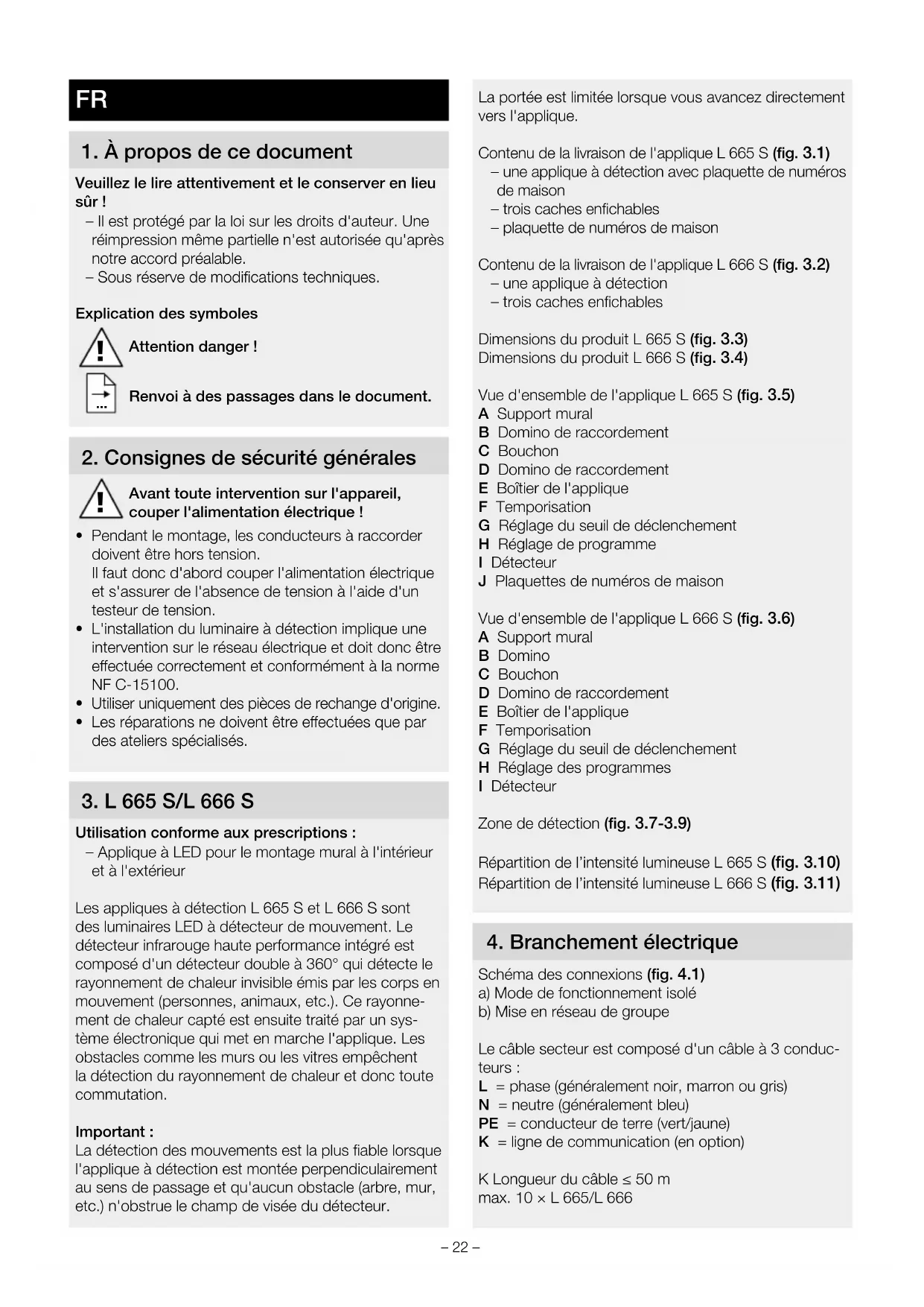 Utilisation conforme aux prescriptions: – Applique à LED pour le montage mural à l'intérieur et à l'extérieur Les appliques à détection L 665 S et L 666 S sont des luminaires LED à détecteur de mouvement. Le détecteur infrarouge haute performance intégré est composé d'un détecteur double à 360° qui détecte le rayonnement de chaleur invisible émis par les corps en mouvement (personnes, animaux, etc.). Ce rayonne- ment de chaleur capté est ensuite traité par un sys- tème électronique qui met en marche l'applique. Les obstacles comme les murs ou les vitres empêchent la détection du rayonnement de chaleur et donc toute commutation. Important: La détection des mouvements est la plus fiable lorsque l'applique à détection est montée perpendiculairement au sens de passage et qu'aucun obstacle (arbre, mur, etc.) n'obstrue le champ de visée du détecteur. La portée est limitée lorsque vous avancez directement vers l'applique. Contenu de la livraison de l'applique L 665 S (fig. 3.1) – une applique à détection avec plaquette de numéros de maison – trois caches enfichables – plaquette de numéros de maison Contenu de la livraison de l'applique L 666 S (fig. 3.2) – une applique à détection – trois caches enfichables Dimensions du produit L 665 S (fig. 3.3) Dimensions du produit L 666 S (fig. 3.4) Vue d'ensemble de l'applique L 665 S (fig. 3.5) A Support mural B Domino de raccordement C Bouchon D Domino de raccordement E Boîtier de l'applique F Temporisation G Réglage du seuil de déclenchement H Réglage de programme I Détecteur J Plaquettes de numéros de maison Vue d'ensemble de l'applique L 666 S (fig. 3.6) A Support mural B Domino C Bouchon D Domino de raccordement E Boîtier de l'applique F Temporisation G Réglage du seuil de déclenchement H Réglage des programmes I Détecteur Zone de détection (fig. 3.7-3.9) Répartition de l’intensité lumineuse L 665 S (fig. 3.10) Répartition de l’intensité lumineuse L 666 S (fig. 3.11)