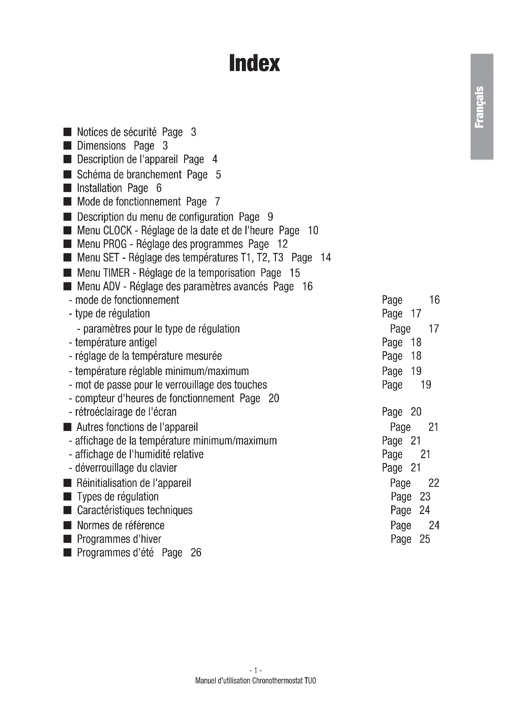 Chronothermostat Numérique TUO Manuel d’utilisation- 1 - Manuel d’utilisation Chronothermostat TUO Français Q Notices de sécurité Page 3 Q Dimensions Page 3 Q Description de l'appareil Page 4 Q Schéma de branchement Page 5 Q Installation Page 6 Q Mode de fonctionnement Page 7 Q Description du menu de configuration Page 9 Q Menu CLOCK - Réglage de la date et de l'heure Page 10 Q Menu PROG - Réglage des programmes Page 12 Q Menu SET - Réglage des températures T1, T2, T3 Page 14 Q Menu TIMER - Réglage de la temporisation Page 15 Q Menu ADV - Réglage des paramètres avancés Page 16 - mode de fonctionnement Page
