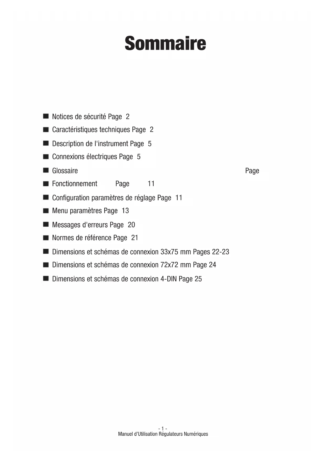Régulateurs Numériques d'Humidité et de Pression HR / PR Manuel d'UtilisationSommaire Notices de sécurité Page 2 Caractéristiques techniques Page 2 Description de l'instrument Page 5 Connexions électriques Page 5 Glossaire Page 6 Fonctionnement Page 11 Configuration paramètres de réglage Page 11 Menu paramètres Page 13 Messages d'erreurs Page 20 Normes de référence Page 21 Dimensions et schémas de connexion 33x75 mm Pages 22-23 Dimensions et schémas de connexion 72x72 mm Page 24 Dimensions et schémas de connexion 4-DIN Page 25