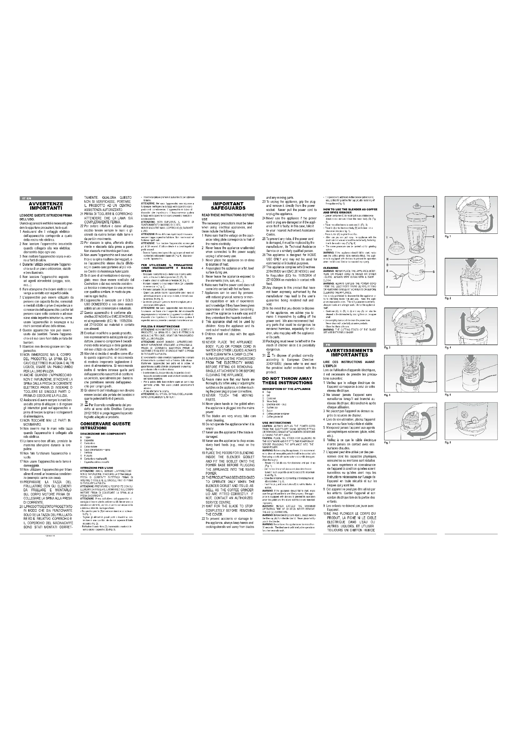 Pour l’élimination correcte du produit aux termes de la Directive Européenne 2012/19/EU, nous vous prions de lire le feuillet qui accompagne le produit. CONSERVEZ SOIGNEUSEMENT CES INSTRUCTIONS DESCRIPTION DE L’APPAREIL (Fig. 1) A Bouchon B Couvercle C Récipient D Corps moteur E Cordon d’alimentation F Ventouse G Bouton H Récipient moulin à café I Couvercle du moulin à café