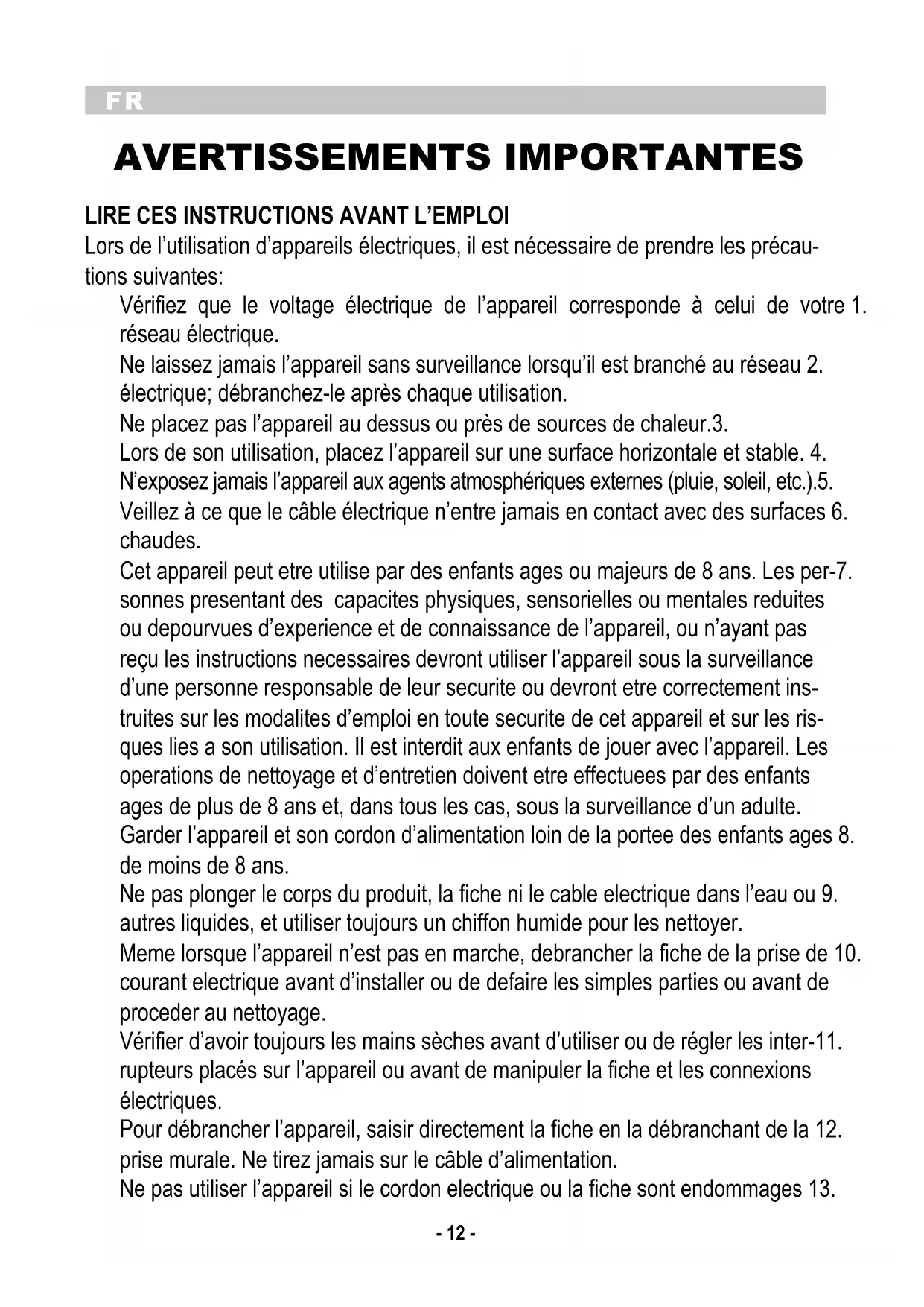 Lors de l’utilisation d’appareils électriques, il est nécessaire de prendre les précau- tions suivantes: Vérifiez que le voltage électrique de l’appareil corresponde à celui de votre 1. réseau électrique. Ne laissez jamais l’appareil sans surveillance lorsqu’il est branché au réseau 2. électrique; débranchez-le après chaque utilisation. Ne placez pas l’appareil au dessus ou près de sources de chaleur.3. Lors de son utilisation, placez l’appareil sur une surface horizontale et stable. 4. N’exposez jamais l’appareil aux agents atmosphériques externes (pluie, soleil, etc.).5. Veillez à ce que le câble électrique n’entre jamais en contact avec des surfaces 6. chaudes. Cet appareil peut etre utilise par des enfants ages ou majeurs de 8 ans. Les per-7. sonnes presentant des capacites physiques, sensorielles ou mentales reduites ou depourvues d’experience et de connaissance de l’appareil, ou n’ayant pas reçu les instructions necessaires devront utiliser l’appareil sous la surveillance d’une personne responsable de leur securite ou devront etre correctement ins- truites sur les modalites d’emploi en toute securite de cet appareil et sur les ris- ques lies a son utilisation. Il est interdit aux enfants de jouer avec l’appareil. Les operations de nettoyage et d’entretien doivent etre effectuees par des enfants ages de plus de 8 ans et, dans tous les cas, sous la surveillance d’un adulte. Garder l’appareil et son cordon d’alimentation loin de la portee des enfants ages 8. de moins de 8 ans. Ne pas plonger le corps du produit, la fiche ni le cable electrique dans l’eau ou 9. autres liquides, et utiliser toujours un chiffon humide pour les nettoyer. Meme lorsque l’appareil n’est pas en marche, debrancher la fiche de la prise de 10. courant electrique avant d’installer ou de defaire les simples parties ou avant de proceder au nettoyage. Vérifier d’avoir toujours les mains sèches avant d’utiliser ou de régler les inter-11. rupteurs placés sur l’appareil ou avant de manipuler la fiche et les connexions électriques. Pour débrancher l’appareil, saisir directement la fiche en la débranchant de la 12. prise murale. Ne tirez jamais sur le câble d’alimentation. Ne pas utiliser l’appareil si le cordon electrique ou la fiche sont endommages 13.FR