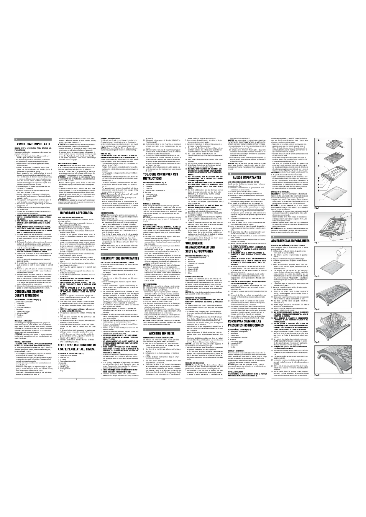INSTRUCTIONS DESCRIPTION DE L’APPAREIL (Fig. 1) A Double grille à blocage automatique B Grille base C Corps grill D Voyant lumineux température OK E Thermostat F Leviers de blocage G Interrupteur ON/OFF H Résistances I Plateau