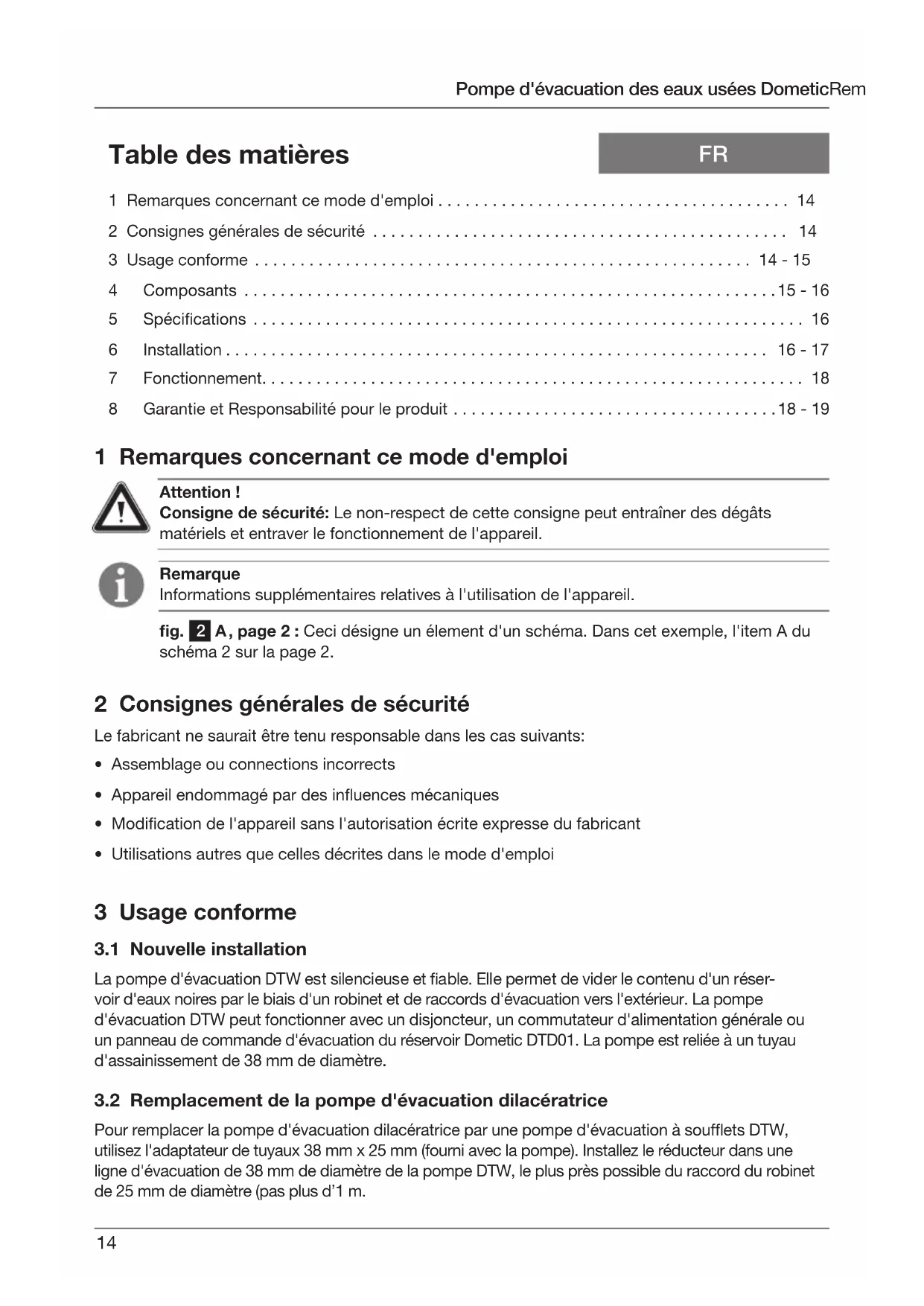 Pompe d'évacuation des eaux usées Mode d'emploi ....................14