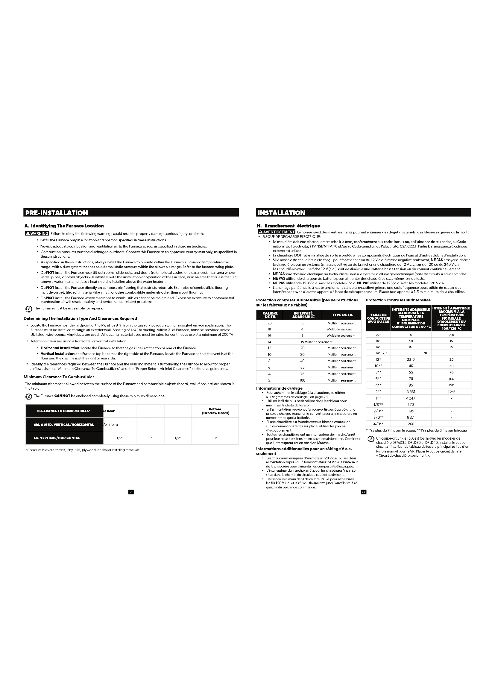 - L'allumage par étincelle à haute tension directe de la chaudière génère une radiofréquence susceptible de causer des interférences avec d'autres appareils à base de microprocesseurs. Placer tout appareil à 1,5m minimum de la chaudière. Protection contre les surintensités (pas de restrictions sur les faisceaux de câbles) CALIBRE DE FIL INTENSITÉ ADMISSIBLE