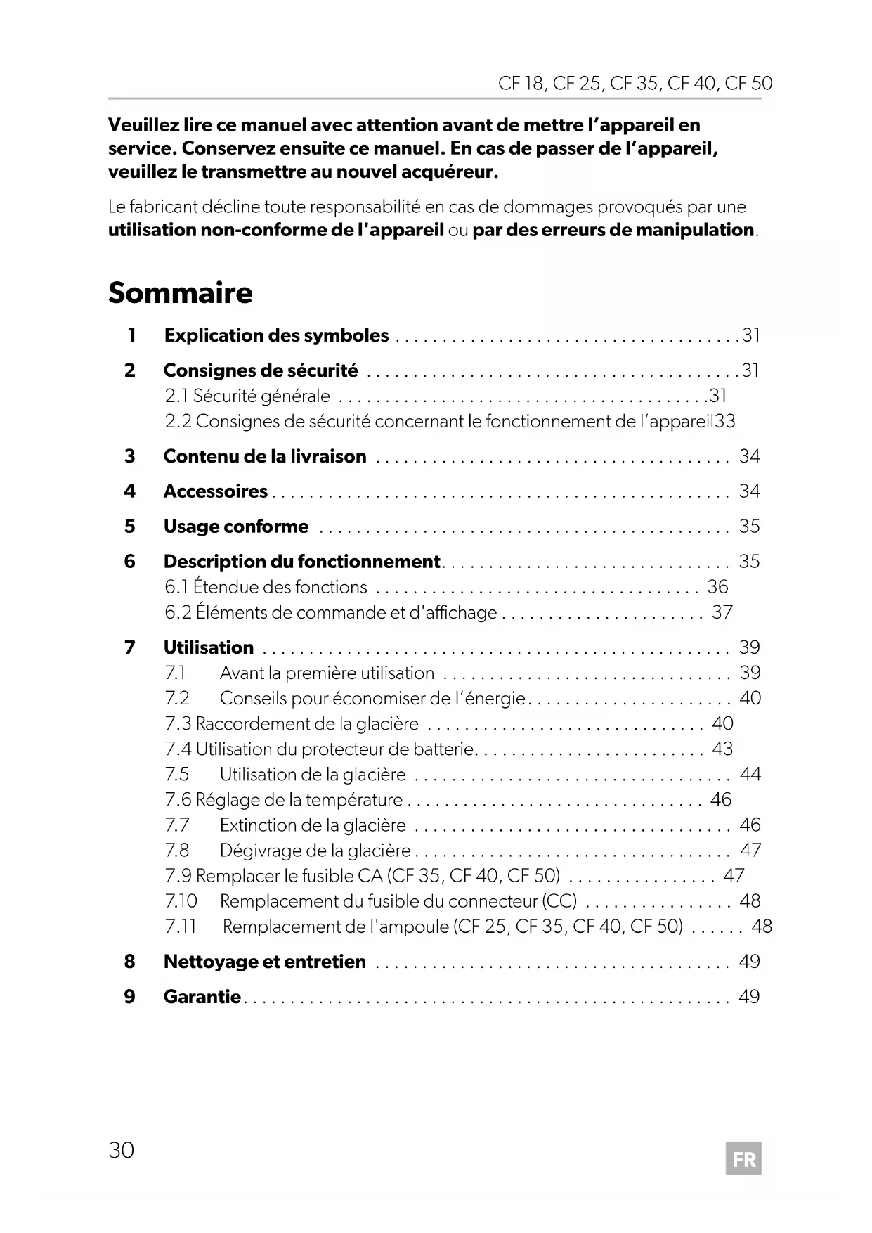 vous devez dans tous les cas brancher un disjoncteur différentiel entre le circuit de courant alternatif 120 V et la glacière. Veuillez vous renseigner auprès d'un spécialiste.FR CF 18, CF 25, CF 35, CF 40, CF 50 Utilisation
