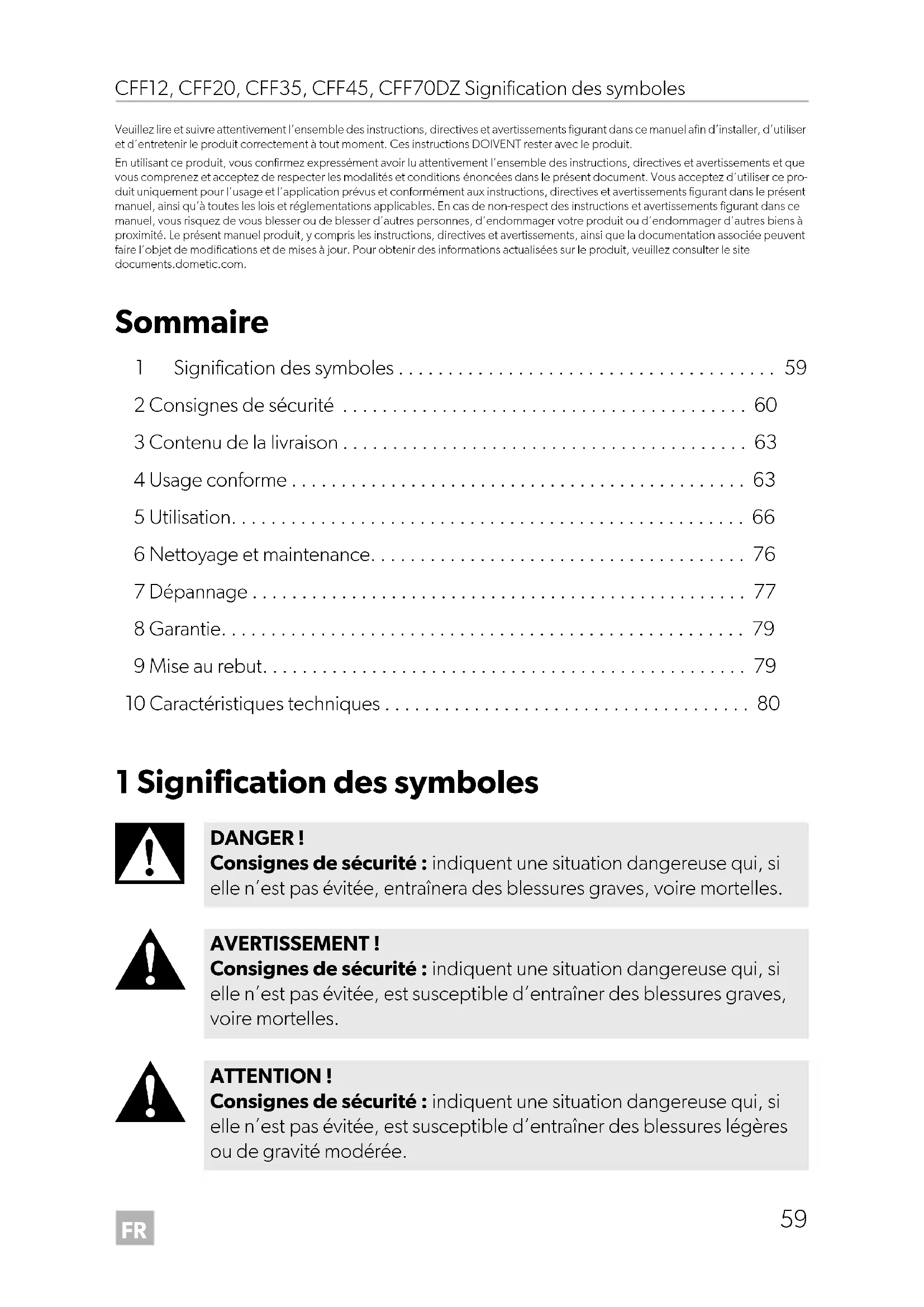 DANGER ! Consignes de sécurité : indiquent une situation dangereuse qui, si elle n’est pas évitée, entraînera des blessures graves, voire mortelles. AVERTISSEMENT ! Consignes de sécurité : indiquent une situation dangereuse qui, si elle n’est pas évitée, est susceptible d’entraîner des blessures graves, voire mortelles. ATTENTION ! Consignes de sécurité : indiquent une situation dangereuse qui, si elle n’est pas évitée, est susceptible d’entraîner des blessures légères ou de gravité modérée. DometicCFF12-20-35-45-70DZ_OPM_4445103134_EMEA17_202x-xx-xx.book Page 59 Friday, September 16, 2022 12:19 PMFR Consignes de sécurité CFF12, CFF20, CFF35, CFF45, CFF70DZ