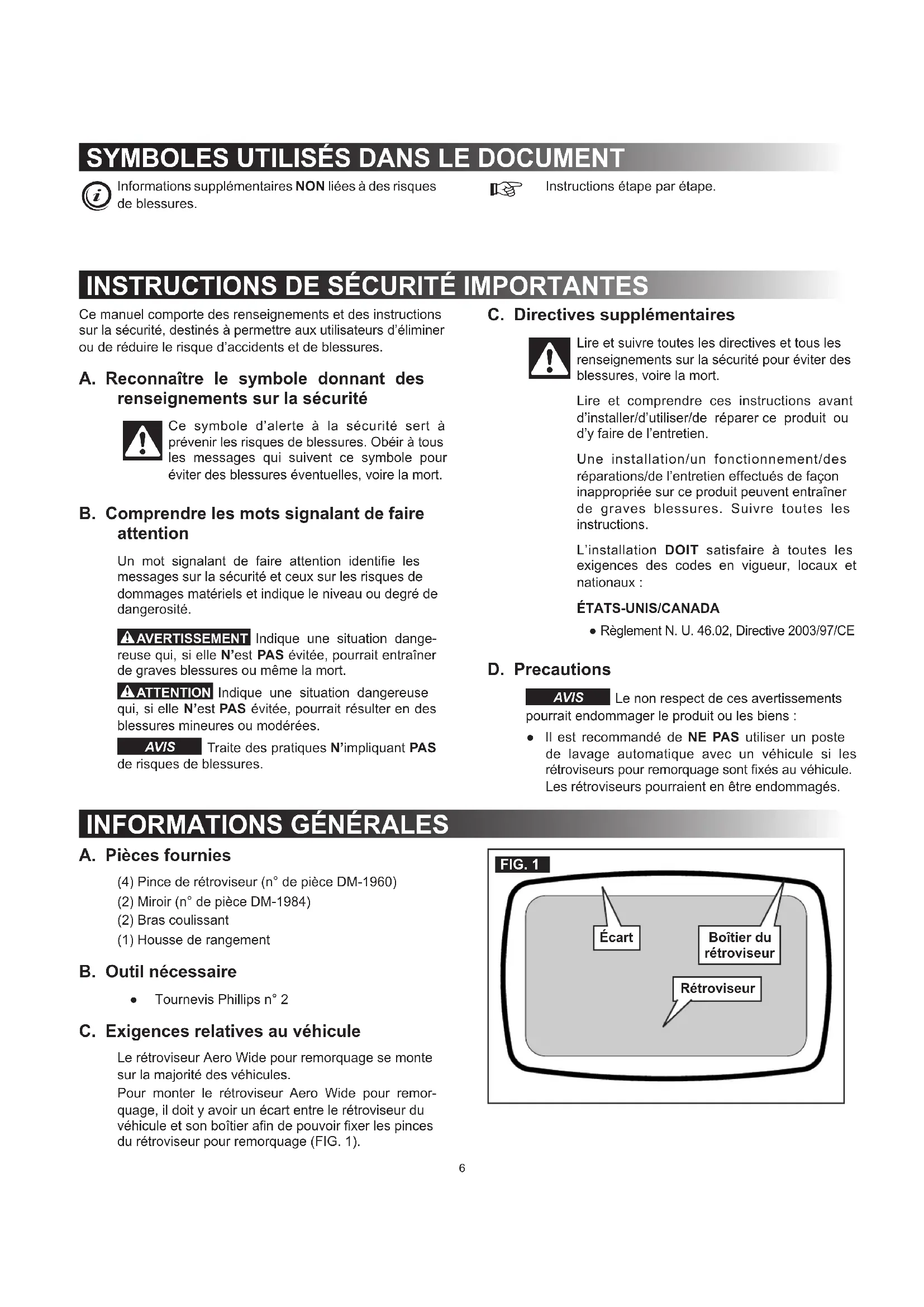 REPORTER ULTÉRIEUREMENT : N° de modèle N° de série Date d’achat Détaillant/Installateur qualié INSTRUCTIONS D’INSTALLATION6 C. Directives supplémentaires Lire et suivre toutes les directives et tous les renseignements sur la sécurité pour éviter des blessures, voire la mort. Lire et comprendre ces instructions avant d’installer/d’utiliser/de réparer ce produit ou d’y faire de l’entretien. Une installation/un fonctionnement/des réparations/de l’entretien effectués de façon inappropriée sur ce produit peuvent entraîner de graves blessures. Suivre toutes les instructions. L’installation DOIT satisfaire à toutes les exigences des codes en vigueur, locaux et nationaux : ÉTATS-UNIS/CANADA ● Règlement N. U. 46.02, Directive 2003/97/CE D. Precautions Le non respect de ces avertissements pourrait endommager le produit ou les biens : ● Il est recommandé de NE PAS utiliser un poste de lavage automatique avec un véhicule si les rétroviseurs pour remorquage sont xés au véhicule. Les rétroviseurs pourraient en être endommagés. Ce manuel comporte des renseignements et des instructions sur la sécurité, destinés à permettre aux utilisateurs d’éliminer ou de réduire le risque d’accidents et de blessures. A. Reconnaître le symbole donnant des renseignements sur la sécurité Ce symbole d’alerte à la sécurité sert à prévenir les risques de blessures. Obéir à tous les messages qui suivent ce symbole pour éviter des blessures éventuelles, voire la mort. B. Comprendre les mots signalant de faire attention Un mot signalant de faire attention identie les messages sur la sécurité et ceux sur les risques de dommages matériels et indique le niveau ou degré de dangerosité. Indique une situation dange- reuse qui, si elle N’est PAS évitée, pourrait entraîner de graves blessures ou même la mort. Indique une situation dangereuse qui, si elle N’est PAS évitée, pourrait résulter en des blessures mineures ou modérées. Traite des pratiques N’impliquant PAS de risques de blessures.