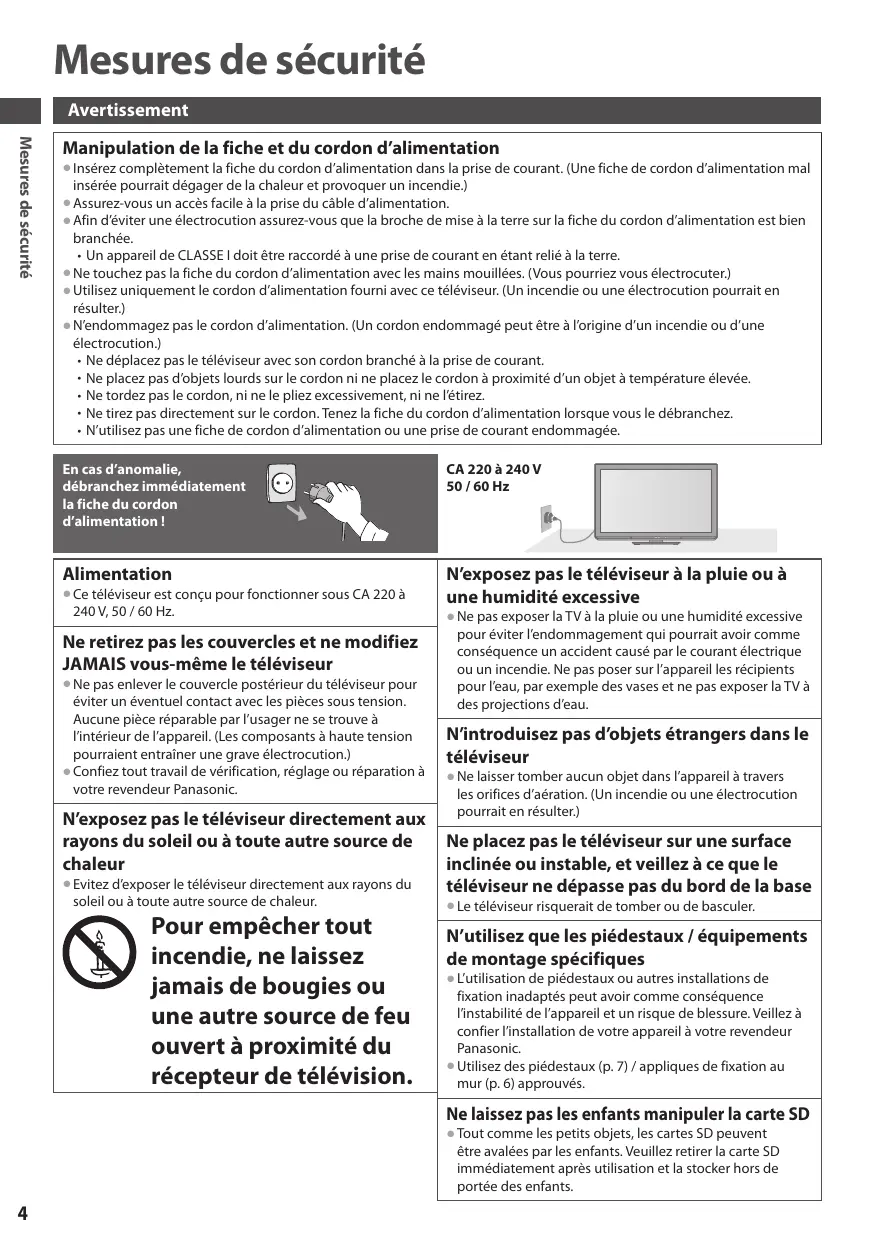 touchez pas la fiche du cordon d’alimentation avec les mains mouillées. (Vous pourriez vous électrocuter.) • Ne uniquement le cordon d’alimentation fourni avec ce téléviseur. (Un incendie ou une électrocution pourrait en • Utilisez résulter.) pas le cordon d’alimentation. (Un cordon endommagé peut être à l’origine d’un incendie ou d’une • N’endommagez électrocution.) • • • • •