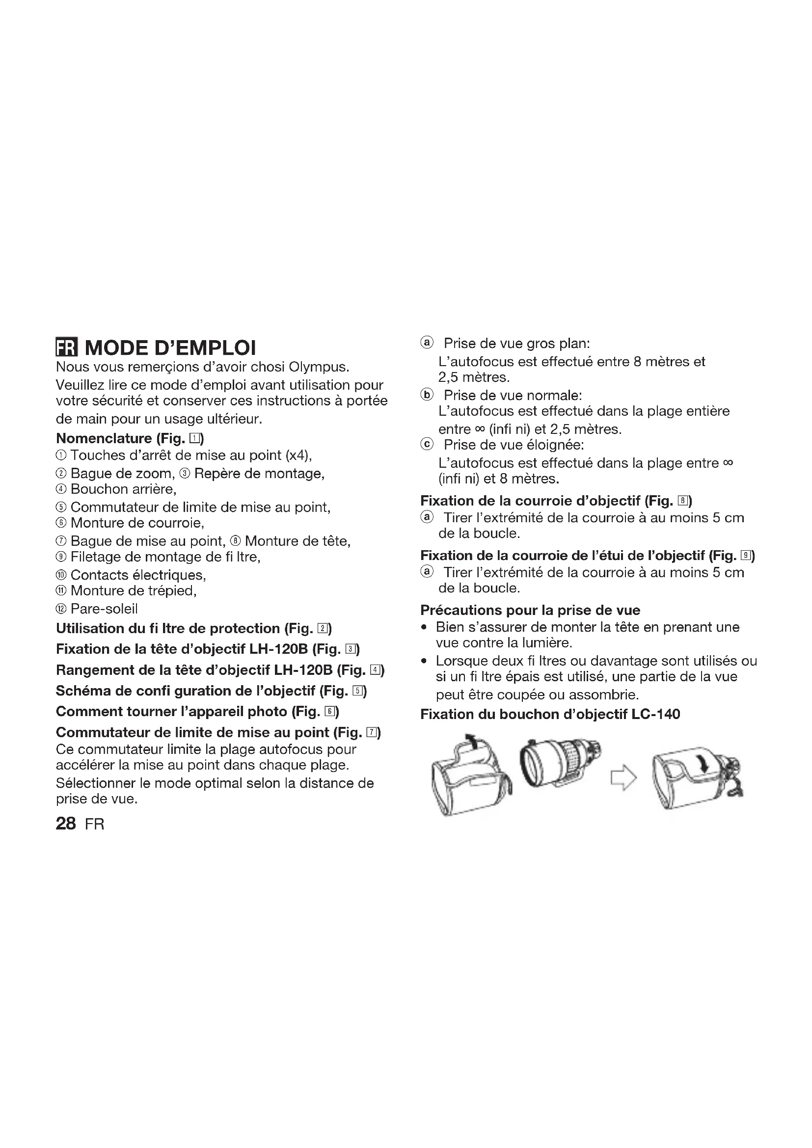 Nous vous remerçions d’avoir chosi Olympus. Veuillez lire ce mode d’emploi avant utilisation pour votre sécurité et conserver ces instructions à portée de main pour un usage ultérieur. Nomenclature (Fig. 1) 1 Touches d’arrêt de mise au point (x4), 2 Bague de zoom, 3 Repère de montage, 4 Bouchon arrière, 5 Commutateur de limite de mise au point, 6 Monture de courroie, 7 Bague de mise au point, 8 Monture de tête, 9 Filetage de montage de fi ltre, 0 Contacts électriques, q Monture de trépied, w Pare-soleil Utilisation du fi ltre de protection (Fig. 2) Fixation de la tête d’objectif LH-120B (Fig. 3) Rangement de la tête d’objectif LH-120B (Fig. 4) Schéma de confi guration de l’objectif (Fig. 5) Comment tourner l’appareil photo (Fig. 6) Commutateur de limite de mise au point (Fig. 7) Ce commutateur limite la plage autofocus pour accélérer la mise au point dans chaque plage. Sélectionner le mode optimal selon la distance de prise de vue.