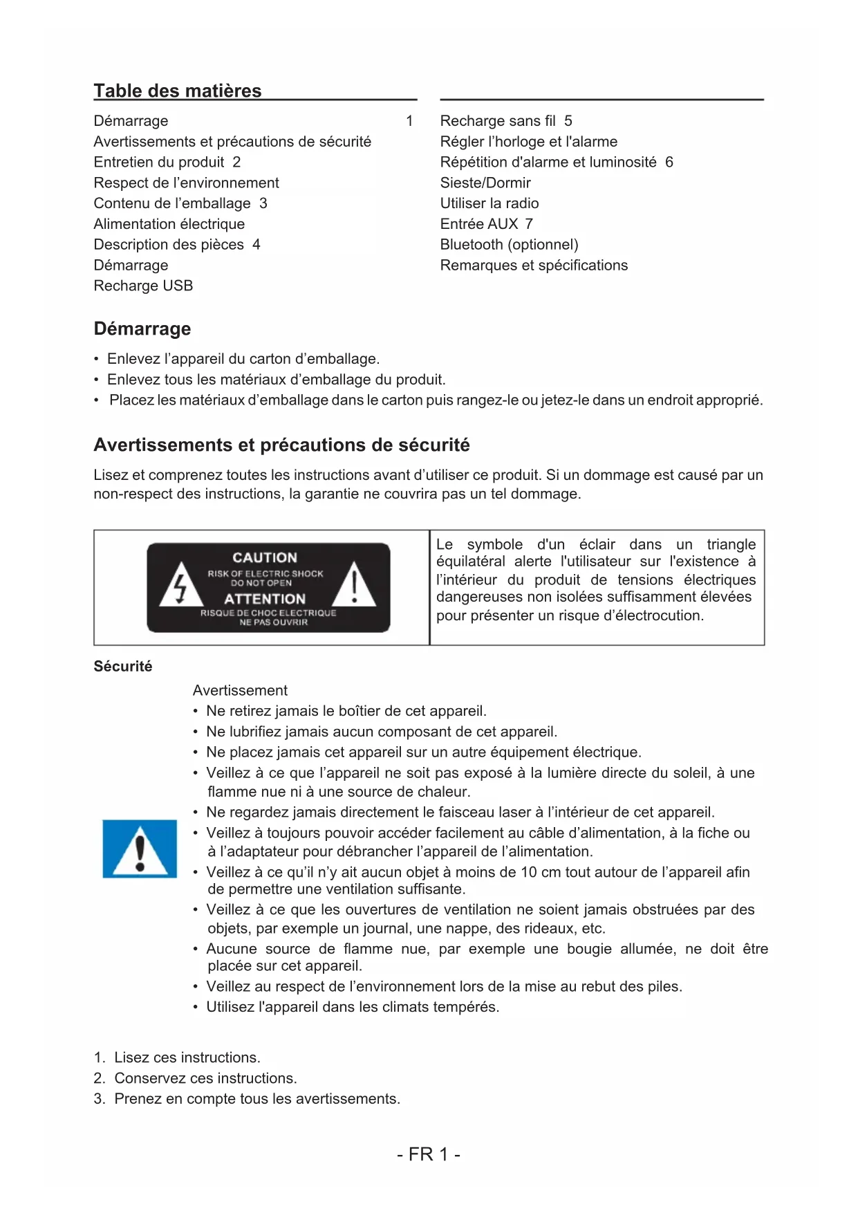 LISEZ ATTENTIVEMENT LE MODE D’EMPLOI AVANT UTILISATION ET CONSERVEZ-LE POUR CONSULTATION ULTÉRIEURE. FR- FR 1 - Table des matières Démarrage 1 Avertissements et précautions de sécurité Entretien du produit 2 Respect de l’environnement Contenu de l’emballage 3 Alimentation électrique Description des pièces 4 Démarrage Recharge USB Recharge sans l 5 Régler l’horloge et l'alarme Répétition d'alarme et luminosité 6 Sieste/Dormir Utiliser la radio Entrée AUX 7 Bluetooth (optionnel) Remarques et spécications Démarrage