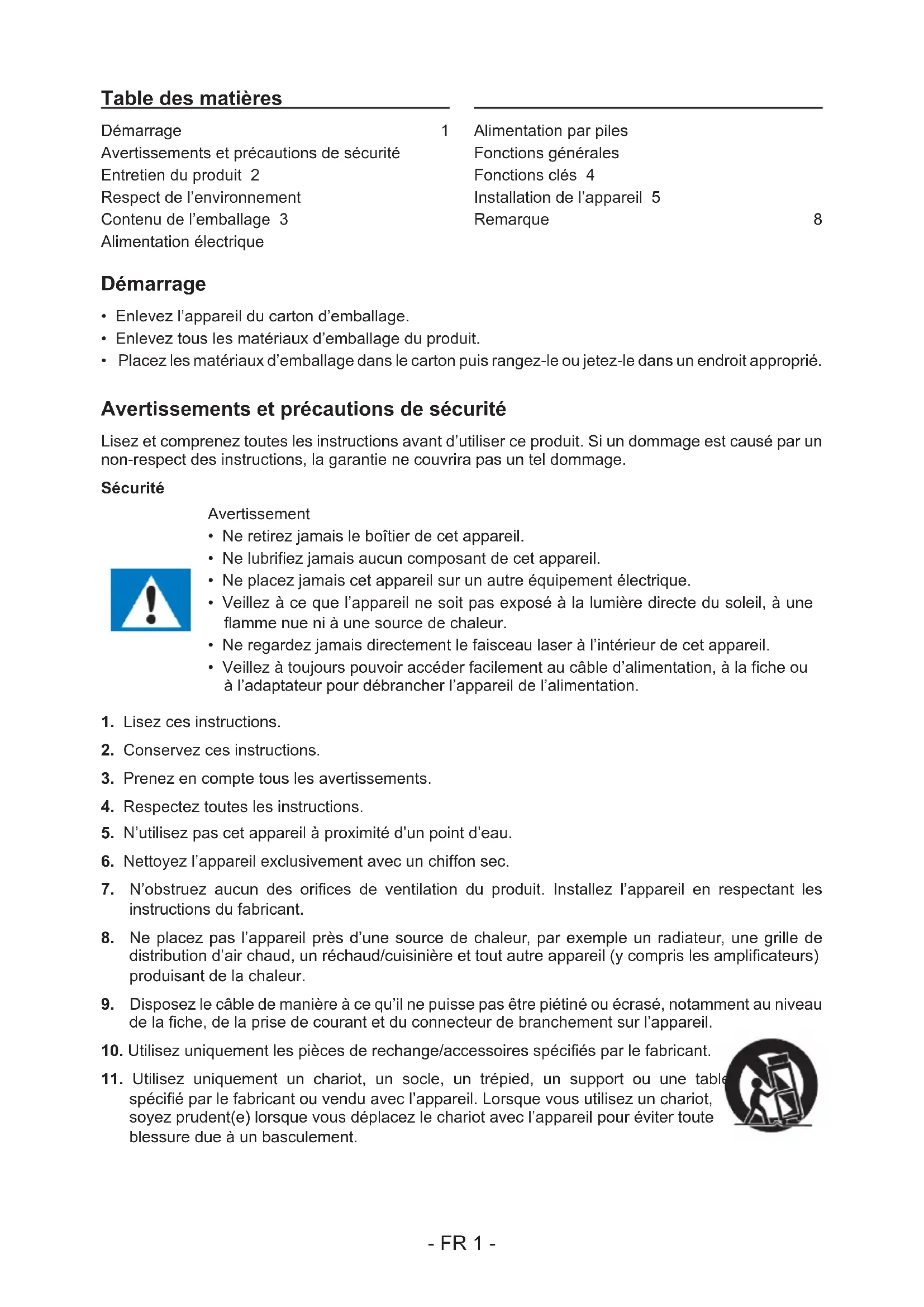LISEZ COMPLÈTEMENT CE MANUEL D’UTILISATION AVANT D’UTILISER CET APPAREIL ET CONSERVEZ CE LIVRET POUR VOUS Y RÉFÉRER ULTÉRIEUREMENT. FR- FR 1 - Table des matières Démarrage 1 Avertissements et précautions de sécurité Entretien du produit 2 Respect de l’environnement Contenu de l’emballage 3 Alimentation électrique Alimentation par piles Fonctions générales Fonctions clés 4 Installation de l’appareil 5 Remarque 8 Démarrage