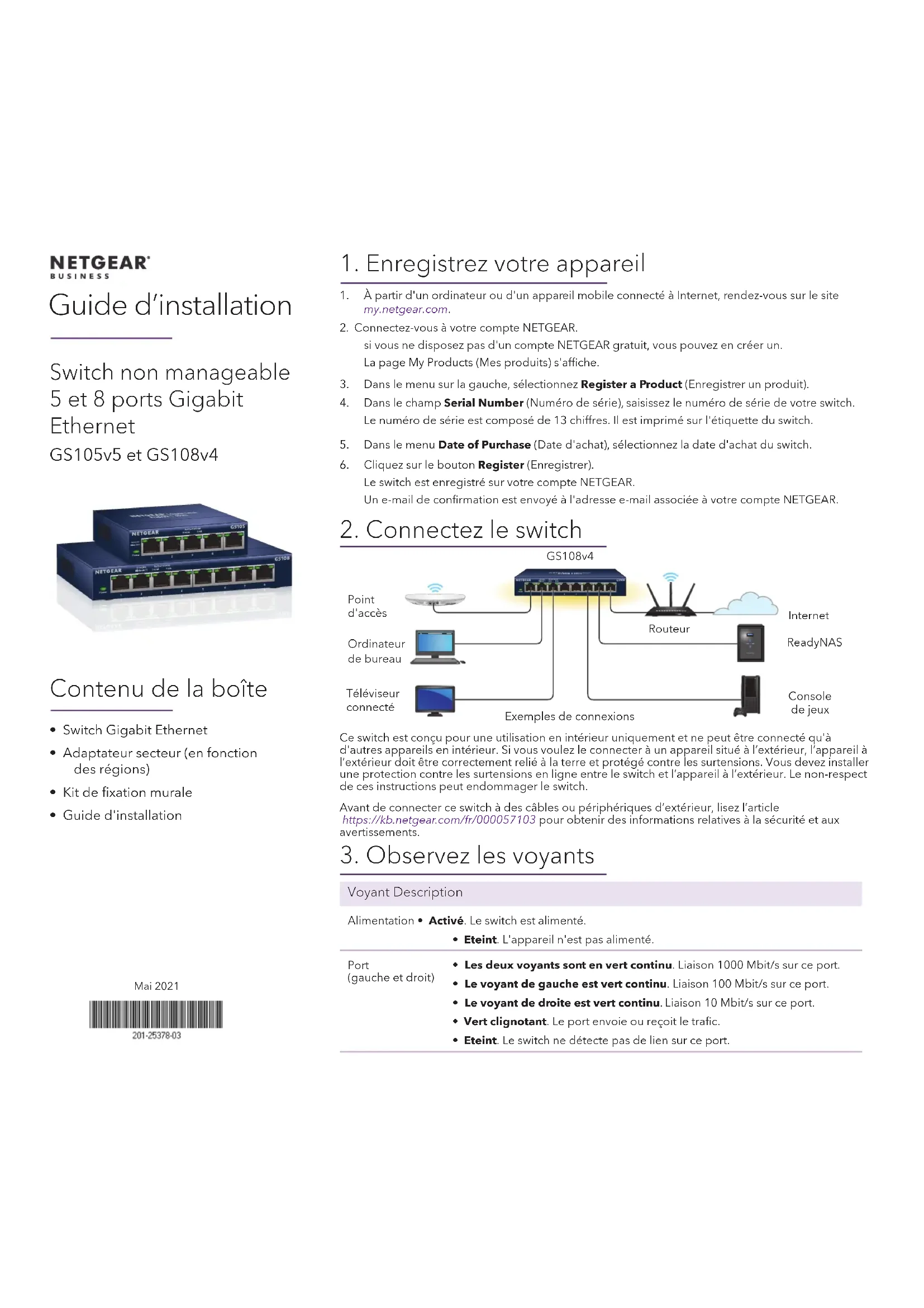 - Vert clignotant. Le port envoie ou reçoit le trac.• Eteint. Le switch ne détecte pas de lien sur ce port.GS108v4Mai 2021ReadyNASCe switch est conçu pour une utilisation en intérieur uniquement et ne peut être connecté qu'à d'autres appareils en intérieur. Si vous voulez le connecter à un appareil situé à l’extérieur, l’appareil à l’extérieur doit être correctement relié à la terre et protégé contre les surtensions. Vous devez installer une protection contre les surtensions en ligne entre le switch et l’appareil à l’extérieur. Le non-respect de ces instructions peut endommager le switch.Avant de connecter ce switch à des câbles ou périphériques d’extérieur, lisez l’article https://kb.netgear.com/fr/000057103 pour obtenir des informations relatives à la sécurité et aux avertissements.Support et communauté Visitez netgear.com/support pour obtenir des réponses à vos questions et accéder aux derniers téléchargements. Vous pouvez également consulter notre communauté NETGEAR pour obtenir de bons conseils sur community.netgear.com. Règlementation et aspects juridiques Pour les informations à propos de la conformité réglementaire, y compris la Déclaration de conformité pour l'UE, rendez-vous sur https://www.netgear.com/about/regulatory/. Avant de brancher l’alimentation, reportez- vous au document de conformité légale. Fixation murale du switch Le panneau inférieur du switch comprend deux orices de xation. La distance centre à centre entre les orices est de: