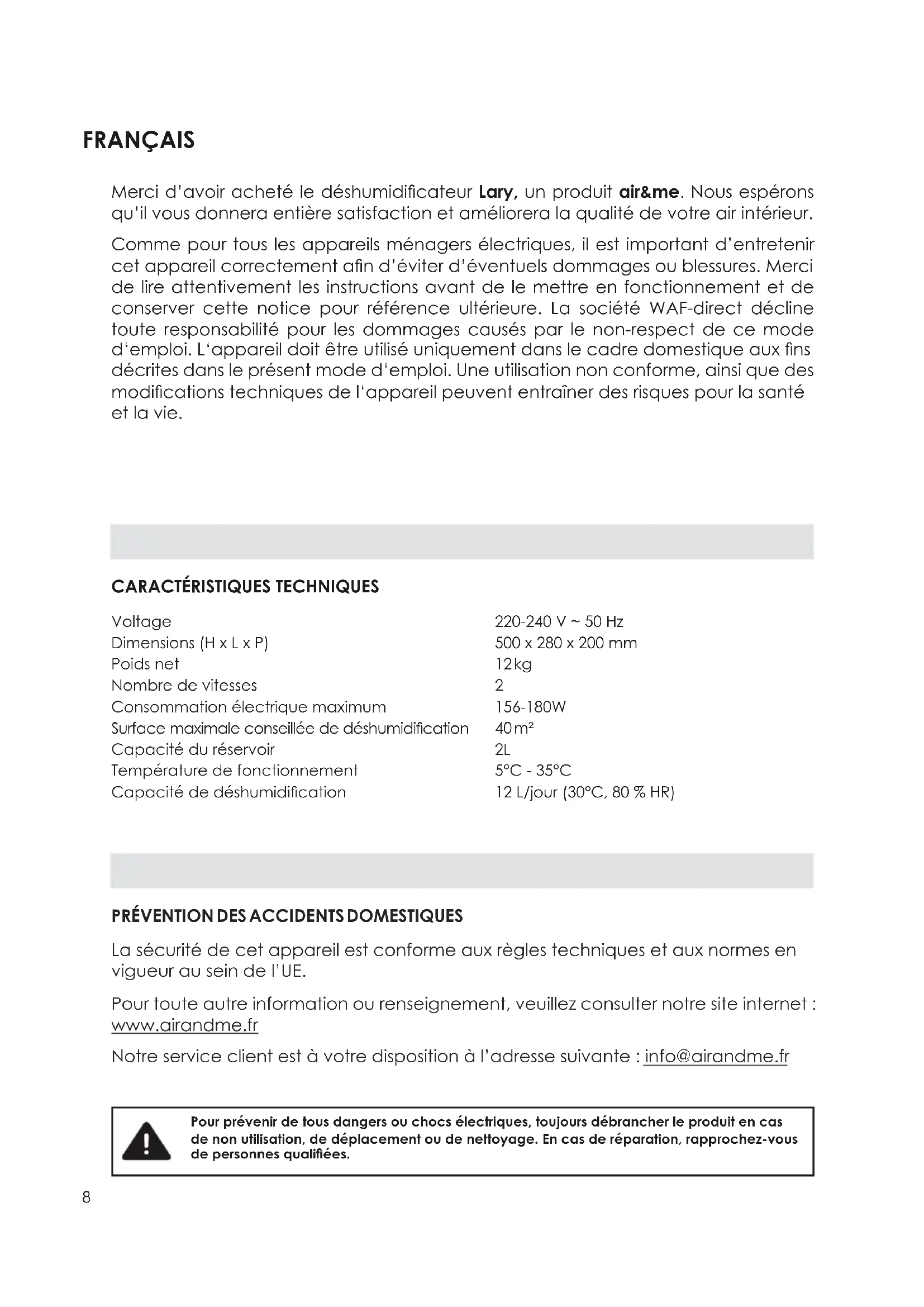dans un endroit propre, sec et ventilé. 12FAQ Problème Raison Solution L’appareil ne marche pas > Le produit n’est pas correctement branché ou il y a un problème de concordance électrique. > Branchez correctement la prise en vous assurant du voltage et du bon fonctionnement du réseau électrique. Évitez les multiprises. > Il y a un problème sur le réseau électrique du logement. > Le réservoir est plein. > Videz le réservoir. > Le réservoir n’est pas correctement enclenché. > Poussez et enclenchez correctement le réservoir. Baisse de performance de l’appareil (moins d’eau dans le réservoir) > Le pré-ltre est sale, ce qui gêne le ux d’air. > Nettoyez le pré-ltre. > L’entrée ou la sortie d’air est bloquée par quelque chose. > Laissez au moins un espace de 20 cm à l’arrière, sur les côtés et devant l’appareil. > La température est trop basse. > En dessous de 15°C le produit fonctionne en Mode « Anti-gel ». Le produit ne peut donc pas déshumidier au maximum de sa capacité. > Le taux d’humidité est déjà bas. Bruit anormal > Quelque chose bloque le ventilateur. > Assurez-vous qu’aucun objet bloque le ux d’air. > Le produit a un problème de fonctionnement. > Rapprochez-vous de votre revendeur pour une prise en charge SAV. Afchage E2 > Problème de capteur d’hygrométrie. > Rapprochez-vous de votre revendeur pour une prise en charge SAV. Afchage LO > Le taux d’humidité ambiant est inférieur à 35 %. L’appareil s’arrête par sécurité. > Augmentez le taux d’humidité dans la pièce avec un humidicateur d’air (www.airandme.fr/ humidicateur-d-air). Afchage HI > Le taux d’humidité ambiant est supérieur à 95 %. L’appareil s’arrête par sécurité. Afchage CL > La température ambiante est inférieure à 5°C. L’appareil s’arrête par sécurité. > Augmentez la température dans la pièce avec un chauffage d’appoint (www.airandme.fr/ chauffage-climatisation). Afchage CH > La température ambiante est supérieure à 35°C. L’appareil s’arrête par sécurité. 13Thank you for having purchased the Lary domestic air dehumidier, an air&me product. We hope that it will bring you complete satisfaction and improve your indoor air quality. As with all electrical appliances, it is important to maintain the appliance properly in order to avoid any damage or injury. Please read these instructions carefully before switching the appliance on and keep them for later reference. WAF-direct society accepts no liability for any damage that is caused by noncompliance with this instruction manual. The appliance is only to be used in the household for the intended purposes described in this user manual. Using the appliance for other purposes than the intended ones or performing technical changes to the appliance could be hazardous for health and life. ENGLISH