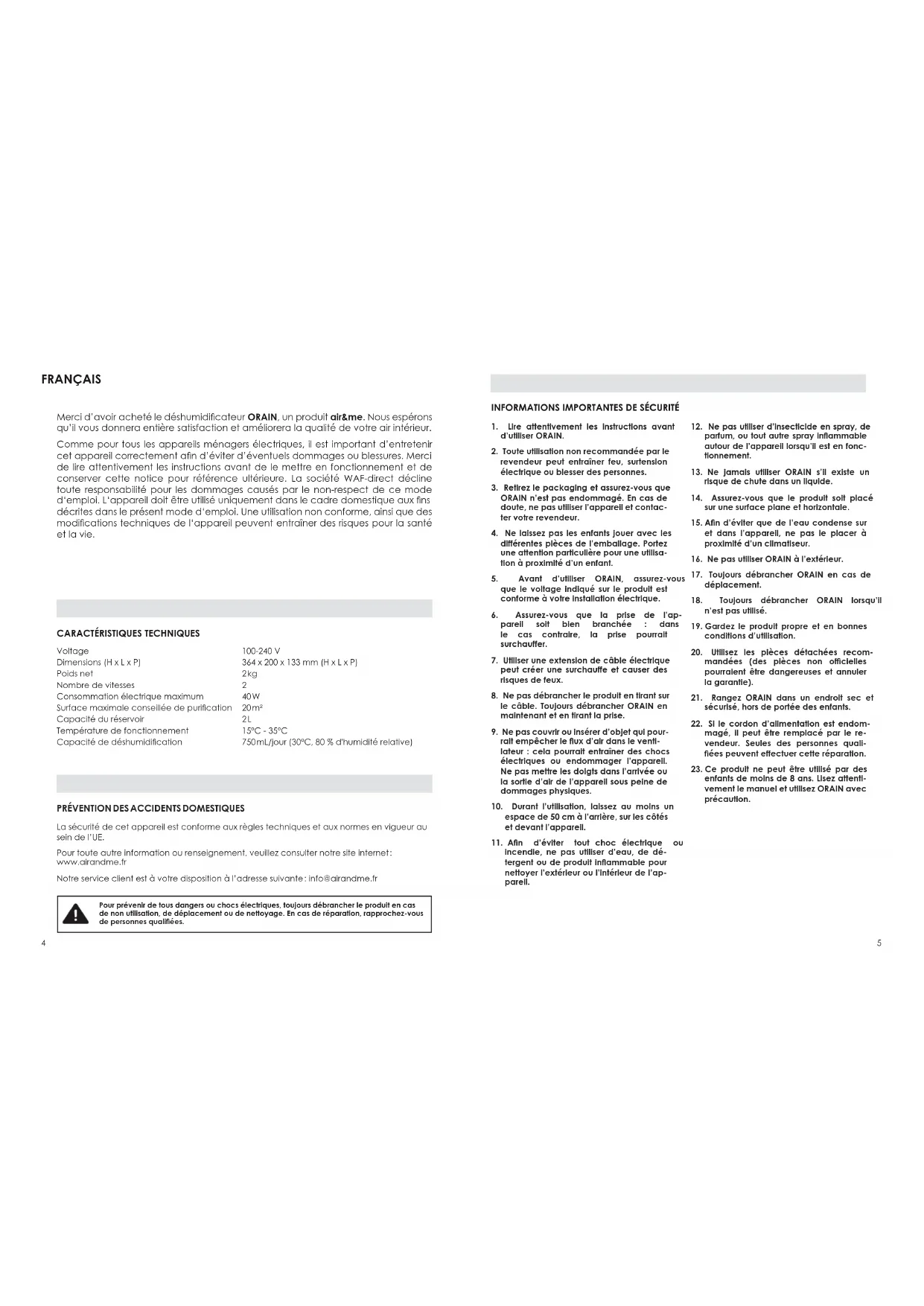 enfants de moins de 8 ans. Lisez attenti- vement le manuel et utilisez ORAIN avec précaution. Merci d’avoir acheté le déshumidicateur ORAIN, un produit air&me. Nous espérons qu’il vous donnera entière satisfaction et améliorera la qualité de votre air intérieur. Comme pour tous les appareils ménagers électriques, il est important d’entretenir cet appareil correctement an d’éviter d’éventuels dommages ou blessures. Merci de lire attentivement les instructions avant de le mettre en fonctionnement et de conserver cette notice pour référence ultérieure. La société WAF-direct décline toute responsabilité pour les dommages causés par le non-respect de ce mode d‘emploi. L‘appareil doit être utilisé uniquement dans le cadre domestique aux ns décrites dans le présent mode d‘emploi. Une utilisation non conforme, ainsi que des modications techniques de l‘appareil peuvent entraîner des risques pour la santé et la vie. FRANÇAIS