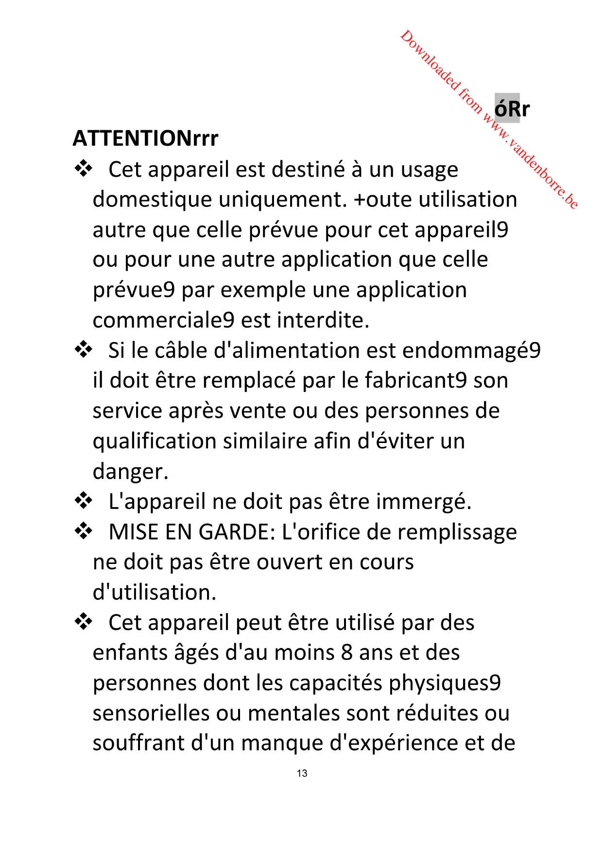 ATTENTION Cet appareil est destiné à un usage domestique uniquement. Toute utilisation autre que celle prévue pour cet appareil, ou pour une autre application que celle prévue, par exemple une application commerciale, est interdite. Si le câble d'alimentation est endommagé, il doit être remplacé par le fabricant, son service après vente ou des personnes de qualification similaire afin d'éviter un danger. L'appareil ne doit pas être immergé. MISE EN GARDE: L'orifice de remplissage ne doit pas être ouvert en cours d'utilisation. Cet appareil peut être utilisé par des enfants âgés d'au moins 8 ans et des personnes dont les capacités physiques, sensorielles ou mentales sont réduites ou souffrant d'un manque d'expérience et de Downloaded from www.vandenborre.be14