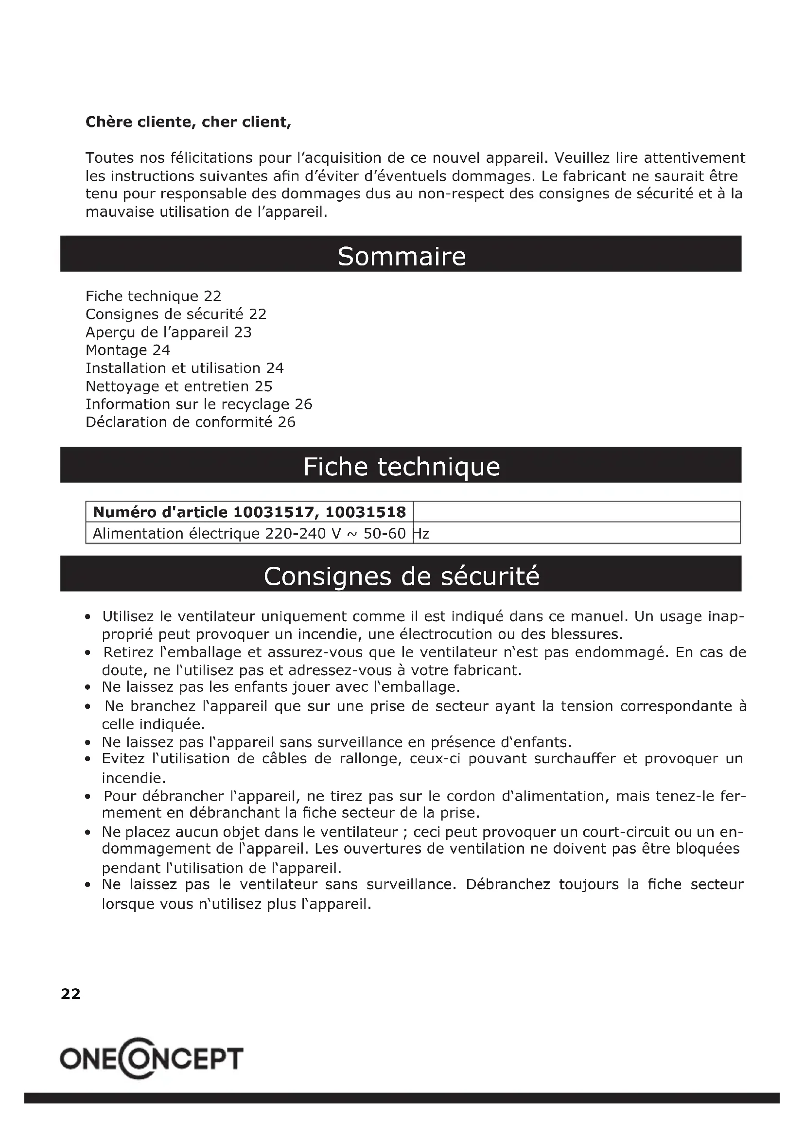 - Utilisez le ventilateur uniquement comme il est indiqué dans ce manuel. Un usage inap- proprié peut provoquer un incendie, une électrocution ou des blessures.