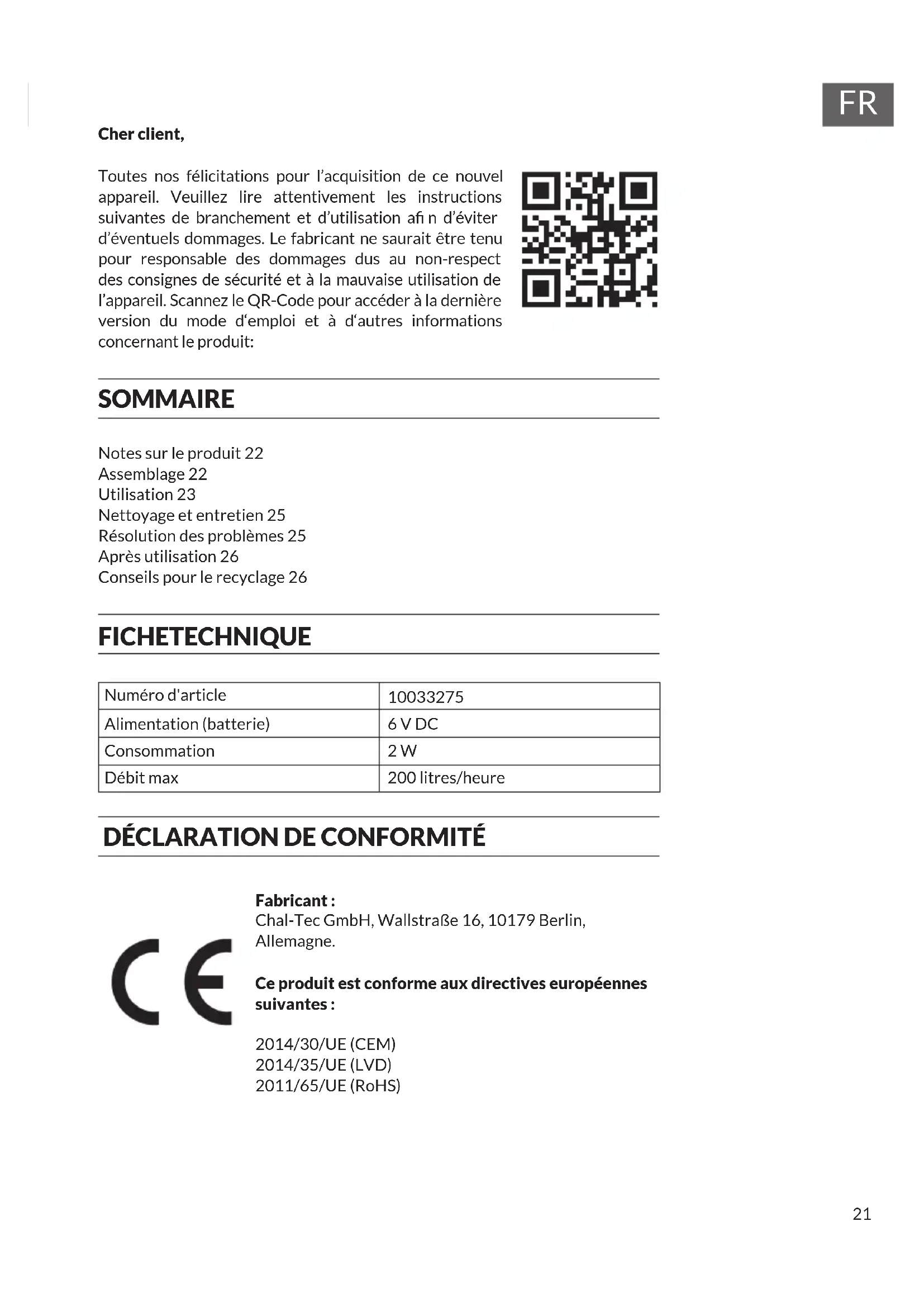 Fabricant : Chal-Tec GmbH, Wallstraße 16, 10179 Berlin, Allemagne. Ce produit est conforme aux directives européennes suivantes : 2014/30/UE (CEM) 2014/35/UE (LVD) 2011/65/UE (RoHS)22