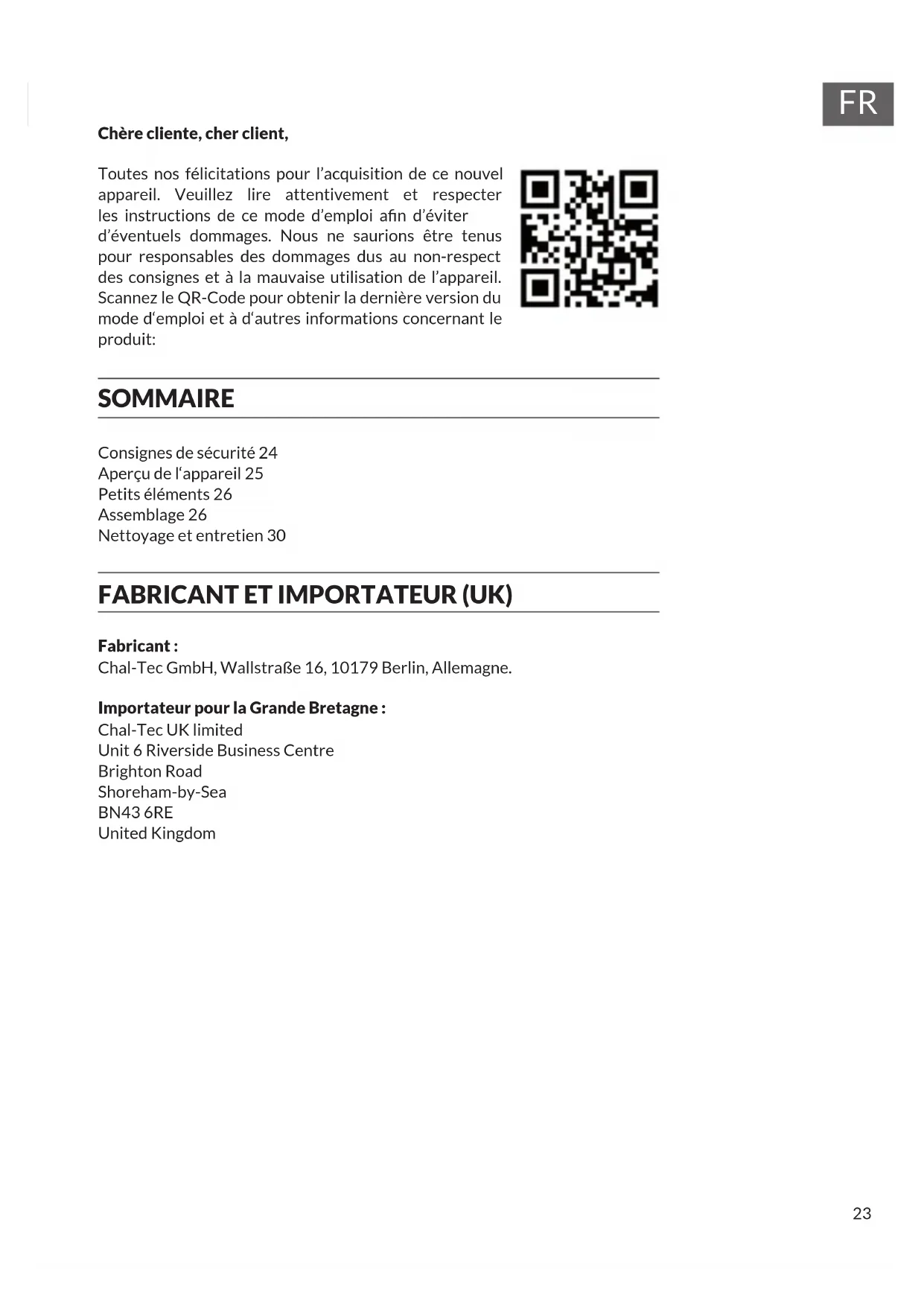 Chère cliente, cher client, Toutes nos félicitations pour l’acquisition de ce nouvel appareil. Veuillez lire attentivement et respecter les instructions de ce mode d’emploi an d’éviter d’éventuels dommages. Nous ne saurions être tenus pour responsables des dommages dus au non-respect des consignes et à la mauvaise utilisation de l’appareil. Scannez le QR-Code pour obtenir la dernière version du mode d‘emploi et à d‘autres informations concernant le produit: SOMMAIRE Consignes de sécurité 24 Aperçu de l‘appareil 25 Petits éléments 26 Assemblage 26 Nettoyage et entretien 30 FABRICANT ET IMPORTATEUR (UK) Fabricant : Chal-Tec GmbH, Wallstraße 16, 10179 Berlin, Allemagne. Importateur pour la Grande Bretagne : Chal-Tec UK limited Unit 6 Riverside Business Centre Brighton Road Shoreham-by-Sea BN43 6RE United Kingdom24