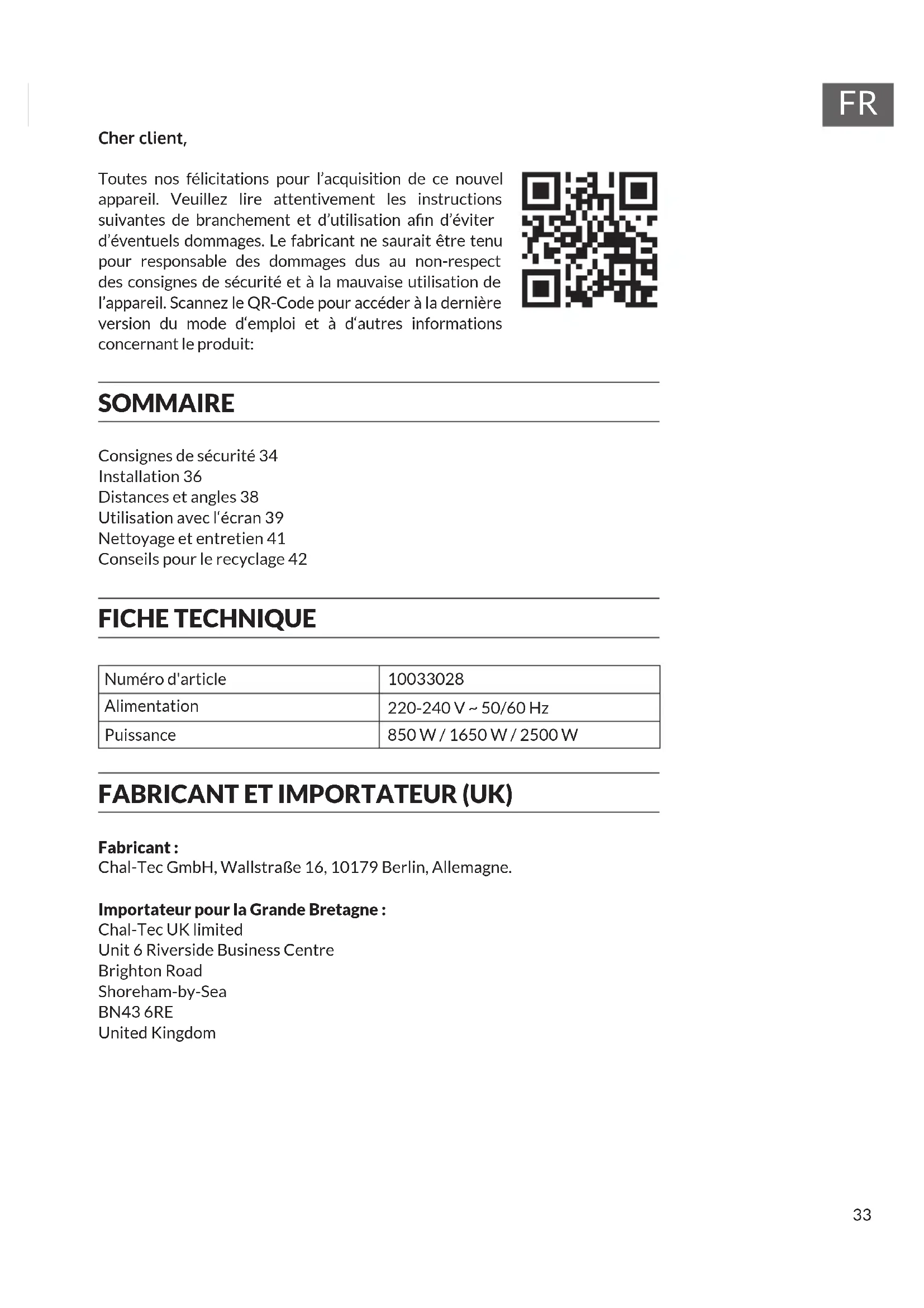 Cher client, Toutes nos félicitations pour l’acquisition de ce nouvel appareil. Veuillez lire attentivement les instructions suivantes de branchement et d’utilisation an d’éviter d’éventuels dommages. Le fabricant ne saurait être tenu pour responsable des dommages dus au non-respect des consignes de sécurité et à la mauvaise utilisation de l’appareil. Scannez le QR-Code pour accéder à la dernière version du mode d‘emploi et à d‘autres informations concernant le produit: SOMMAIRE Consignes de sécurité 34 Installation 36 Distances et angles 38 Utilisation avec l‘écran 39 Nettoyage et entretien 41 Conseils pour le recyclage 42 FICHE TECHNIQUE Numéro d'article