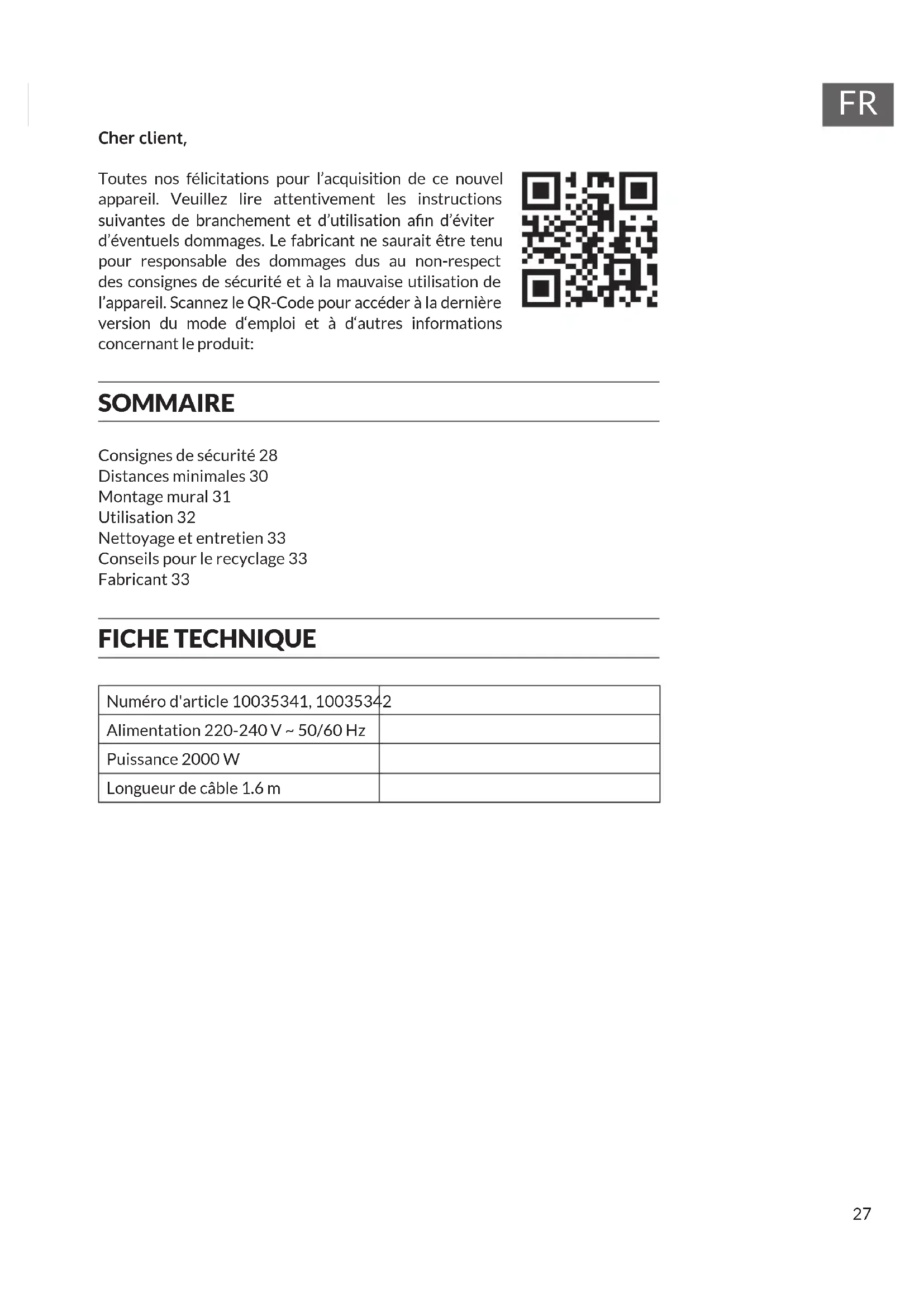 Cher client, Toutes nos félicitations pour l’acquisition de ce nouvel appareil. Veuillez lire attentivement les instructions suivantes de branchement et d’utilisation an d’éviter d’éventuels dommages. Le fabricant ne saurait être tenu pour responsable des dommages dus au non-respect des consignes de sécurité et à la mauvaise utilisation de l’appareil. Scannez le QR-Code pour accéder à la dernière version du mode d‘emploi et à d‘autres informations concernant le produit: SOMMAIRE Consignes de sécurité 28 Distances minimales 30 Montage mural 31 Utilisation 32 Nettoyage et entretien 33 Conseils pour le recyclage 33 Fabricant 33 FICHE TECHNIQUE Numéro d'article 10035341, 10035342 Alimentation 220-240 V ~ 50/60 Hz Puissance 2000 W Longueur de câble 1.6 m28