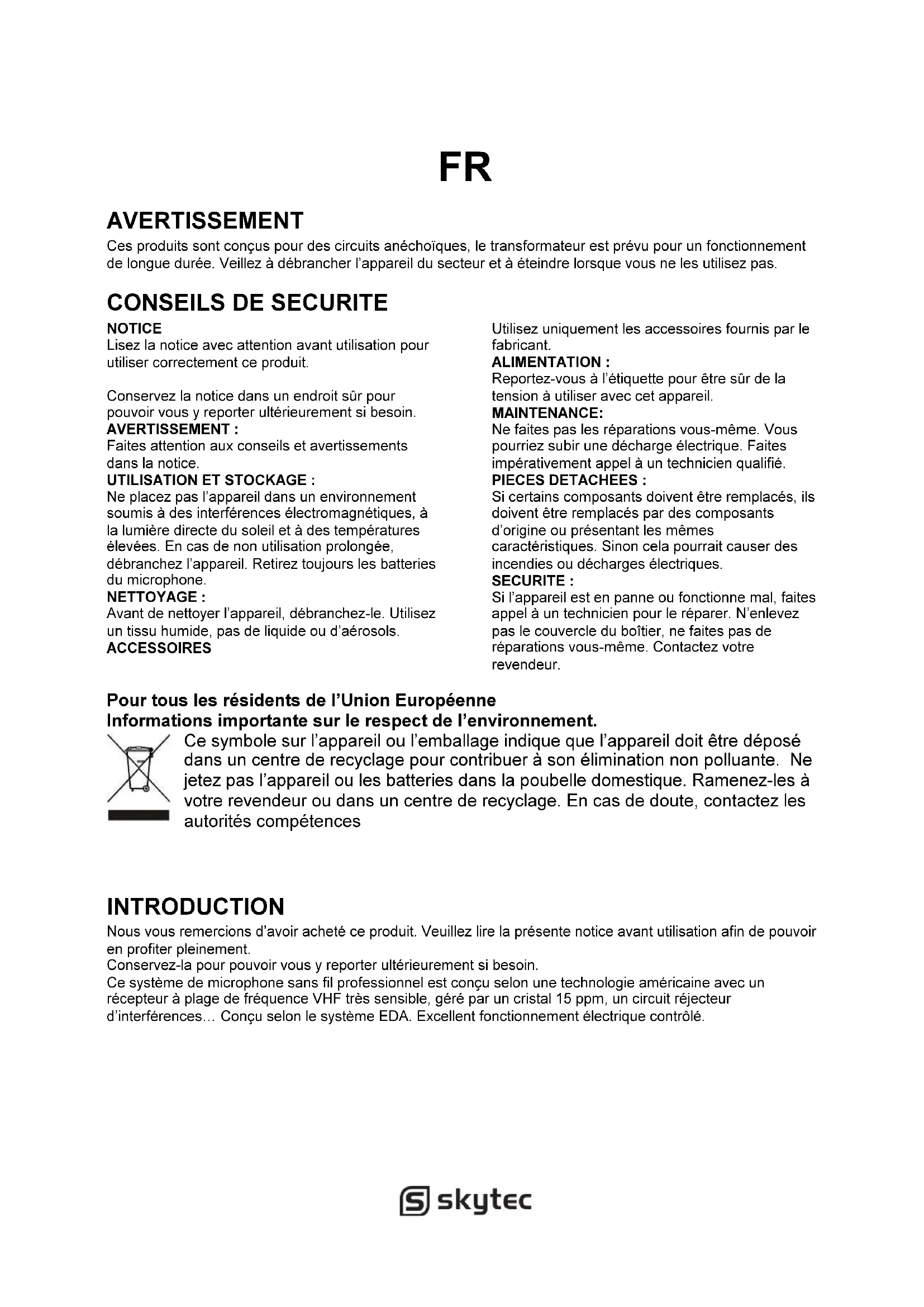 Faites attention aux conseils et avertissements dans la notice. UTILISATION ET STOCKAGE : Ne placez pas l’appareil dans un environnement soumis à des interférences électromagnétiques, à la lumière directe du soleil et à des températures élevées. En cas de non utilisation prolongée, débranchez l’appareil. Retirez toujours les batteries du microphone. NETTOYAGE : Avant de nettoyer l’appareil, débranchez-le. Utilisez un tissu humide, pas de liquide ou d’aérosols. ACCESSOIRES Utilisez uniquement les accessoires fournis par le fabricant. ALIMENTATION : Reportez-vous à l’étiquette pour être sûr de la tension à utiliser avec cet appareil. MAINTENANCE: Ne faites pas les réparations vous-même. Vous pourriez subir une décharge électrique. Faites impérativement appel à un technicien qualifié. PIECES DETACHEES : Si certains composants doivent être remplacés, ils doivent être remplacés par des composants d’origine ou présentant les mêmes caractéristiques. Sinon cela pourrait causer des incendies ou décharges électriques. SECURITE : Si l’appareil est en panne ou fonctionne mal, faites appel à un technicien pour le réparer. N’enlevez pas le couvercle du boîtier, ne faites pas de réparations vous-même. Contactez votre revendeur. Pour tous les résidents de l’Union Européenne Informations importante sur le respect de l’environnement. Ce symbole sur l’appareil ou l’emballage indique que l’appareil doit être déposé dans un centre de recyclage pour contribuer à son élimination non polluante. Ne jetez pas l’appareil ou les batteries dans la poubelle domestique. Ramenez-les à votre revendeur ou dans un centre de recyclage. En cas de doute, contactez les autorités compétences INTRODUCTION Nous vous remercions d’avoir acheté ce produit. Veuillez lire la présente notice avant utilisation afin de pouvoir en profiter pleinement. Conservez-la pour pouvoir vous y reporter ultérieurement si besoin. Ce système de microphone sans fil professionnel est conçu selon une technologie américaine avec un récepteur à plage de fréquence VHF très sensible, géré par un cristal 15 ppm, un circuit réjecteur d’interférences_ Conçu selon le système EDA. Excellent fonctionnement électrique contrôlé.CARACTERISTIQUES