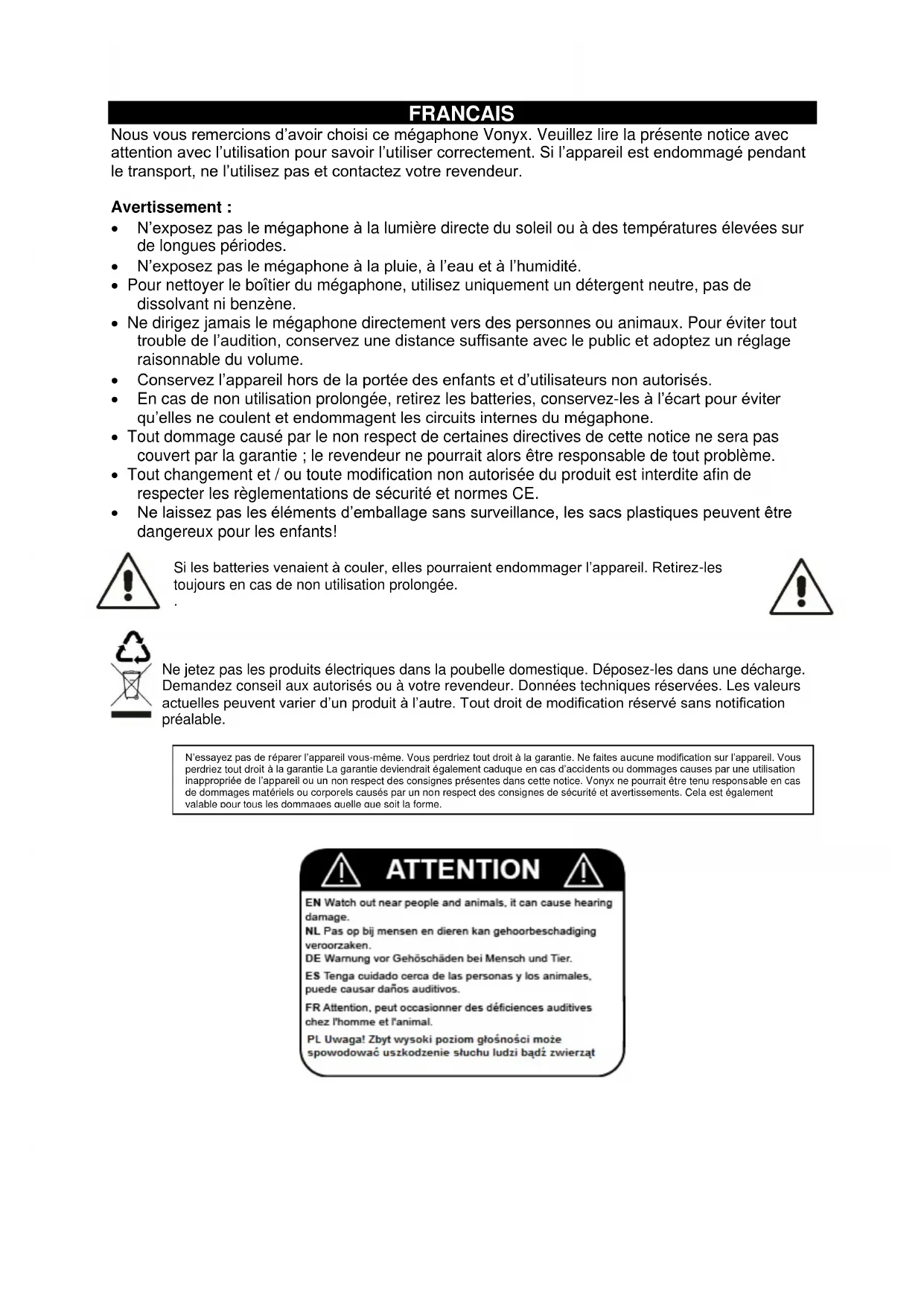 - En cas de non utilisation prolongée, retirez les batteries, conservez-les à l’écart pour éviter qu’elles ne coulent et endommagent les circuits internes du mégaphone.