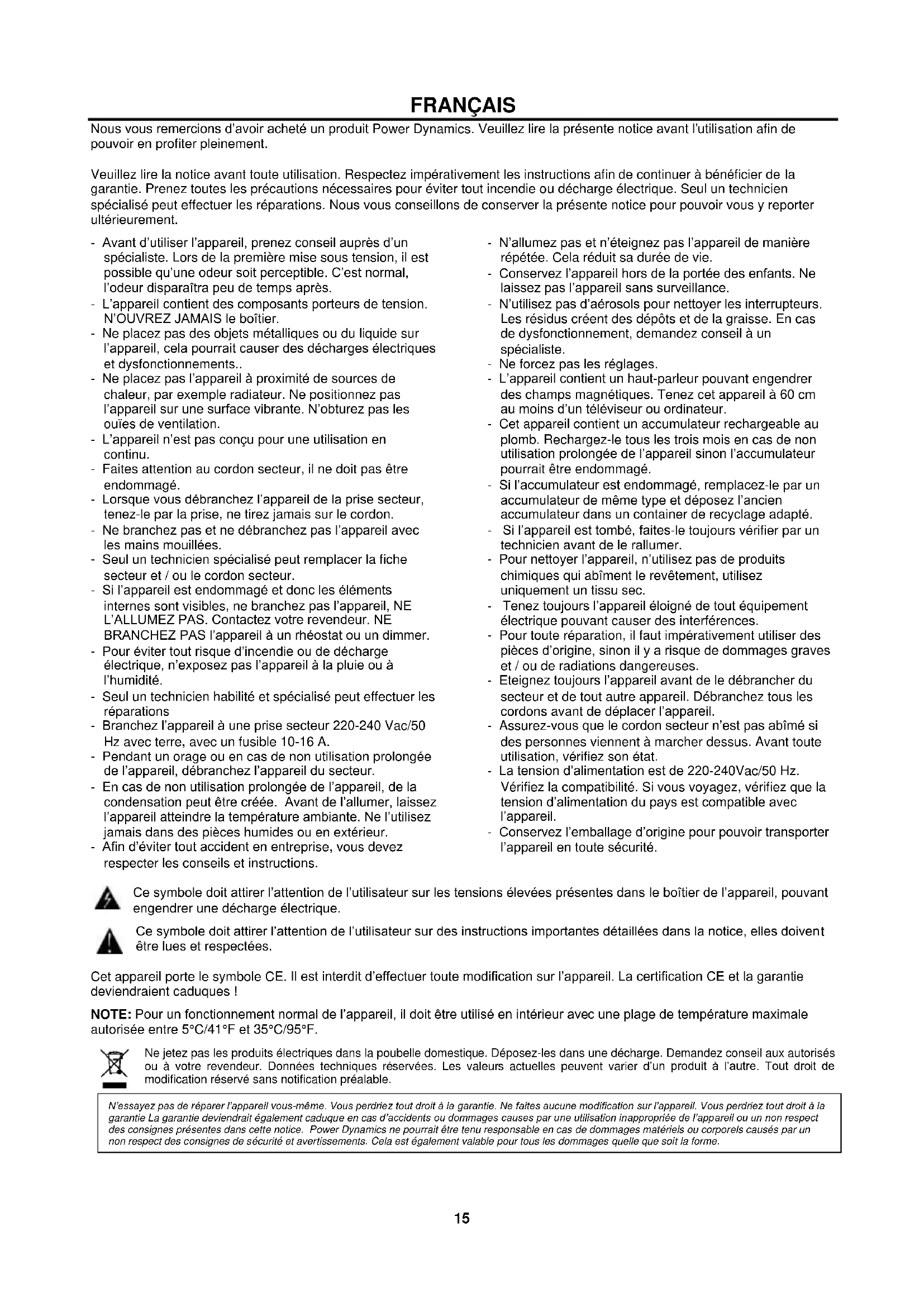 sobrecarga (22) responde a la señal seleccionada para la función de monitor. Utilice el control de monitor (21) para ajustar el volumen.15 FRANÇAIS Nous vous remercions d’avoir acheté un produit Power Dynamics. Veuillez lire la présente notice avant l’utilisation afin de pouvoir en profiter pleinement. Veuillez lire la notice avant toute utilisation. Respectez impérativement les instructions afin de continuer à bénéficier de la garantie. Prenez toutes les précautions nécessaires pour éviter tout incendie ou décharge électrique. Seul un technicien spécialisé peut effectuer les réparations. Nous vous conseillons de conserver la présente notice pour pouvoir vous y reporter ultérieurement. - Avant d’utiliser l’appareil, prenez conseil auprès d’un spécialiste. Lors de la première mise sous tension, il est possible qu’une odeur soit perceptible. C’est normal, l’odeur disparaîtra peu de temps après. - L’appareil contient des composants porteurs de tension. N’OUVREZ JAMAIS le boîtier. - Ne placez pas des objets métalliques ou du liquide sur l’appareil, cela pourrait causer des décharges électriques et dysfonctionnements.. - Ne placez pas l’appareil à proximité de sources de chaleur, par exemple radiateur. Ne positionnez pas l’appareil sur une surface vibrante. N’obturez pas les ouïes de ventilation. - L’appareil n’est pas conçu pour une utilisation en continu. - Faites attention au cordon secteur, il ne doit pas être endommagé. - Lorsque vous débranchez l’appareil de la prise secteur, tenez-le par la prise, ne tirez jamais sur le cordon. - Ne branchez pas et ne débranchez pas l’appareil avec les mains mouillées. - Seul un technicien spécialisé peut remplacer la fiche secteur et / ou le cordon secteur. - Si l’appareil est endommagé et donc les éléments internes sont visibles, ne branchez pas l’appareil, NE L’ALLUMEZ PAS. Contactez votre revendeur. NE BRANCHEZ PAS l’appareil à un rhéostat ou un dimmer. - Pour éviter tout risque d’incendie ou de décharge électrique, n’exposez pas l’appareil à la pluie ou à l’humidité. - Seul un technicien habilité et spécialisé peut effectuer les réparations - Branchez l’appareil à une prise secteur 220-240 Vac/50 Hz avec terre, avec un fusible 10-16 A. - Pendant un orage ou en cas de non utilisation prolongée de l’appareil, débranchez l’appareil du secteur. - En cas de non utilisation prolongée de l’appareil, de la condensation peut être créée. Avant de l’allumer, laissez l’appareil atteindre la température ambiante. Ne l’utilisez jamais dans des pièces humides ou en extérieur. - Afin d’éviter tout accident en entreprise, vous devez respecter les conseils et instructions. - N’allumez pas et n’éteignez pas l’appareil de manière répétée. Cela réduit sa durée de vie. - Conservez l’appareil hors de la portée des enfants. Ne laissez pas l’appareil sans surveillance. - N’utilisez pas d’aérosols pour nettoyer les interrupteurs. Les résidus créent des dépôts et de la graisse. En cas de dysfonctionnement, demandez conseil à un spécialiste. - Ne forcez pas les réglages. - L’appareil contient un haut-parleur pouvant engendrer des champs magnétiques. Tenez cet appareil à 60 cm au moins d’un téléviseur ou ordinateur. - Cet appareil contient un accumulateur rechargeable au plomb. Rechargez-le tous les trois mois en cas de non utilisation prolongée de l’appareil sinon l’accumulateur pourrait être endommagé. - Si l’accumulateur est endommagé, remplacez-le par un accumulateur de même type et déposez l’ancien accumulateur dans un container de recyclage adapté. - Si l’appareil est tombé, faites-le toujours vérifier par un technicien avant de le rallumer. - Pour nettoyer l’appareil, n’utilisez pas de produits chimiques qui abîment le revêtement, utilisez uniquement un tissu sec. - Tenez toujours l’appareil éloigné de tout équipement électrique pouvant causer des interférences. - Pour toute réparation, il faut impérativement utiliser des pièces d’origine, sinon il y a risque de dommages graves et / ou de radiations dangereuses. - Eteignez toujours l’appareil avant de le débrancher du secteur et de tout autre appareil. Débranchez tous les cordons avant de déplacer l’appareil. - Assurez-vous que le cordon secteur n’est pas abîmé si des personnes viennent à marcher dessus. Avant toute utilisation, vérifiez son état. - La tension d’alimentation est de 220-240Vac/50 Hz. Vérifiez la compatibilité. Si vous voyagez, vérifiez que la tension d’alimentation du pays est compatible avec l’appareil. - Conservez l’emballage d’origine pour pouvoir transporter l’appareil en toute sécurité. Ce symbole doit attirer l’attention de l’utilisateur sur les tensions élevées présentes dans le boîtier de l’appareil, pouvant engendrer une décharge électrique. Ce symbole doit attirer l’attention de l’utilisateur sur des instructions importantes détaillées dans la notice, elles doivent être lues et respectées. Cet appareil porte le symbole CE. Il est interdit d’effectuer toute modification sur l’appareil. La certification CE et la garantie deviendraient caduques ! NOTE: Pour un fonctionnement normal de l’appareil, il doit être utilisé en intérieur avec une plage de température maximale autorisée entre 5°C/41°F et 35°C/95°F. Ne jetez pas les produits électriques dans la poubelle domestique. Déposez-les dans une décharge. Demandez conseil aux autorisés ou à votre revendeur. Données techniques réservées. Les valeurs actuelles peuvent varier d’un produit à l’autre. Tout droit de modification réservé sans notification préalable.