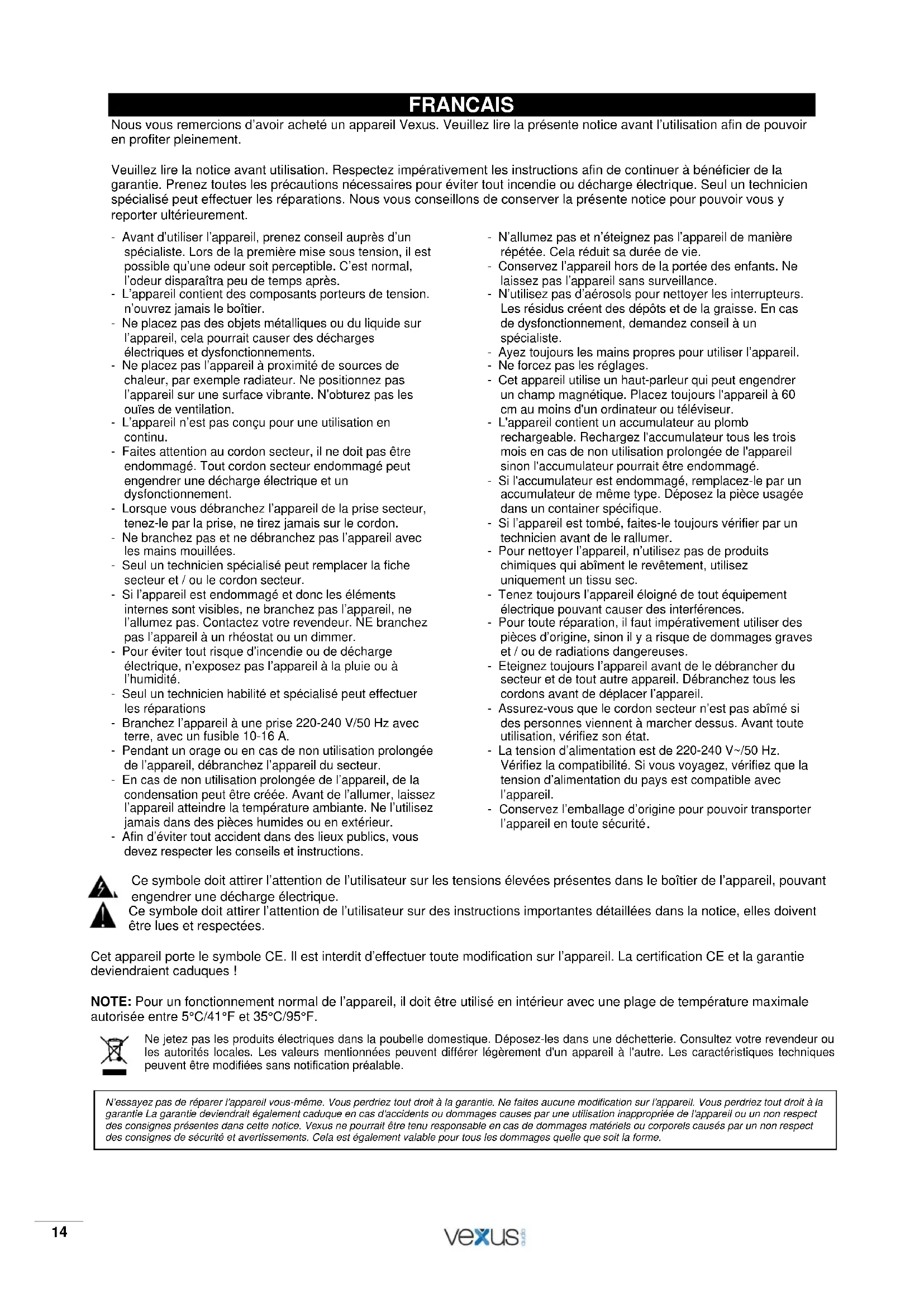 Este botón tiene dos funciones: - Una simple pulsación le permite seleccionar el archivo posterior - Una pulsación larga le permite hacer la búsqueda de vuelta rápida en el archivo14 FRANCAIS Nous vous remercions d’avoir acheté un appareil Vexus. Veuillez lire la présente notice avant l’utilisation afin de pouvoir en profiter pleinement. Veuillez lire la notice avant utilisation. Respectez impérativement les instructions afin de continuer à bénéficier de la garantie. Prenez toutes les précautions nécessaires pour éviter tout incendie ou décharge électrique. Seul un technicien spécialisé peut effectuer les réparations. Nous vous conseillons de conserver la présente notice pour pouvoir vous y reporter ultérieurement. - Avant d’utiliser l’appareil, prenez conseil auprès d’un spécialiste. Lors de la première mise sous tension, il est possible qu’une odeur soit perceptible. C’est normal, l’odeur disparaîtra peu de temps après. - L’appareil contient des composants porteurs de tension. n’ouvrez jamais le boîtier. - Ne placez pas des objets métalliques ou du liquide sur l’appareil, cela pourrait causer des décharges électriques et dysfonctionnements. - Ne placez pas l’appareil à proximité de sources de chaleur, par exemple radiateur. Ne positionnez pas l’appareil sur une surface vibrante. N’obturez pas les ouïes de ventilation. - L’appareil n’est pas conçu pour une utilisation en continu. - Faites attention au cordon secteur, il ne doit pas être endommagé. Tout cordon secteur endommagé peut engendrer une décharge électrique et un dysfonctionnement. - Lorsque vous débranchez l’appareil de la prise secteur, tenez-le par la prise, ne tirez jamais sur le cordon. - Ne branchez pas et ne débranchez pas l’appareil avec les mains mouillées. - Seul un technicien spécialisé peut remplacer la fiche secteur et / ou le cordon secteur. - Si l’appareil est endommagé et donc les éléments internes sont visibles, ne branchez pas l’appareil, ne l’allumez pas. Contactez votre revendeur. NE branchez pas l’appareil à un rhéostat ou un dimmer. - Pour éviter tout risque d’incendie ou de décharge électrique, n’exposez pas l’appareil à la pluie ou à l’humidité. - Seul un technicien habilité et spécialisé peut effectuer les réparations - Branchez l’appareil à une prise 220-240 V/50 Hz avec terre, avec un fusible 10-16 A. - Pendant un orage ou en cas de non utilisation prolongée de l’appareil, débranchez l’appareil du secteur. - En cas de non utilisation prolongée de l’appareil, de la condensation peut être créée. Avant de l’allumer, laissez l’appareil atteindre la température ambiante. Ne l’utilisez jamais dans des pièces humides ou en extérieur. - Afin d’éviter tout accident dans des lieux publics, vous devez respecter les conseils et instructions. - N’allumez pas et n’éteignez pas l’appareil de manière répétée. Cela réduit sa durée de vie. - Conservez l’appareil hors de la portée des enfants. Ne laissez pas l’appareil sans surveillance. - N’utilisez pas d’aérosols pour nettoyer les interrupteurs. Les résidus créent des dépôts et de la graisse. En cas de dysfonctionnement, demandez conseil à un spécialiste. - Ayez toujours les mains propres pour utiliser l’appareil. - Ne forcez pas les réglages. - Cet appareil utilise un haut-parleur qui peut engendrer un champ magnétique. Placez toujours l'appareil à 60 cm au moins d'un ordinateur ou téléviseur. - L'appareil contient un accumulateur au plomb rechargeable. Rechargez l'accumulateur tous les trois mois en cas de non utilisation prolongée de l'appareil sinon l'accumulateur pourrait être endommagé. - Si l'accumulateur est endommagé, remplacez-le par un accumulateur de même type. Déposez la pièce usagée dans un container spécifique. - Si l’appareil est tombé, faites-le toujours vérifier par un technicien avant de le rallumer. - Pour nettoyer l’appareil, n’utilisez pas de produits chimiques qui abîment le revêtement, utilisez uniquement un tissu sec. - Tenez toujours l’appareil éloigné de tout équipement électrique pouvant causer des interférences. - Pour toute réparation, il faut impérativement utiliser des pièces d’origine, sinon il y a risque de dommages graves et / ou de radiations dangereuses. - Eteignez toujours l’appareil avant de le débrancher du secteur et de tout autre appareil. Débranchez tous les cordons avant de déplacer l’appareil. - Assurez-vous que le cordon secteur n’est pas abîmé si des personnes viennent à marcher dessus. Avant toute utilisation, vérifiez son état. - La tension d’alimentation est de 220-240 V~/50 Hz. Vérifiez la compatibilité. Si vous voyagez, vérifiez que la tension d’alimentation du pays est compatible avec l’appareil. - Conservez l’emballage d’origine pour pouvoir transporter l’appareil en toute sécurité